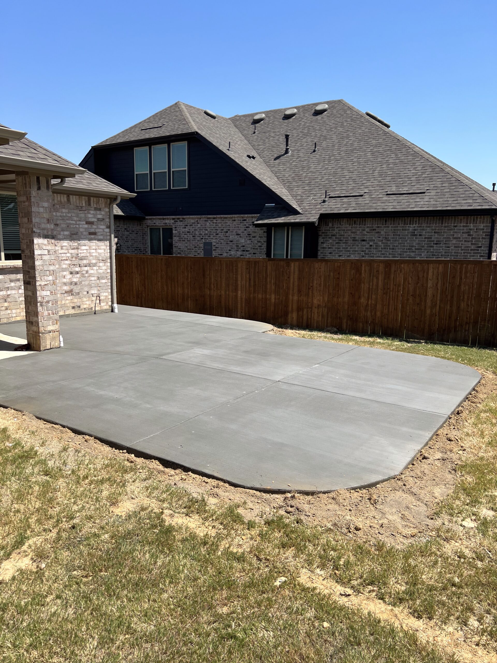 This custom concrete patio in Denton was designed to create a usable outdoor living space with clean lines and long-term durability. The project included curved patio edges for a softer layout, integrated drainage solutions, and underground piping to properly manage roof runoff beneath the slab.