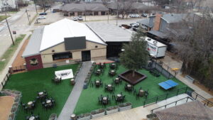 Full commercial bar build in Old Town Lewisville, TX including steel patio cover, Trex deck, ADA ramps, stamped concrete, grading, fencing, and structural renovations.