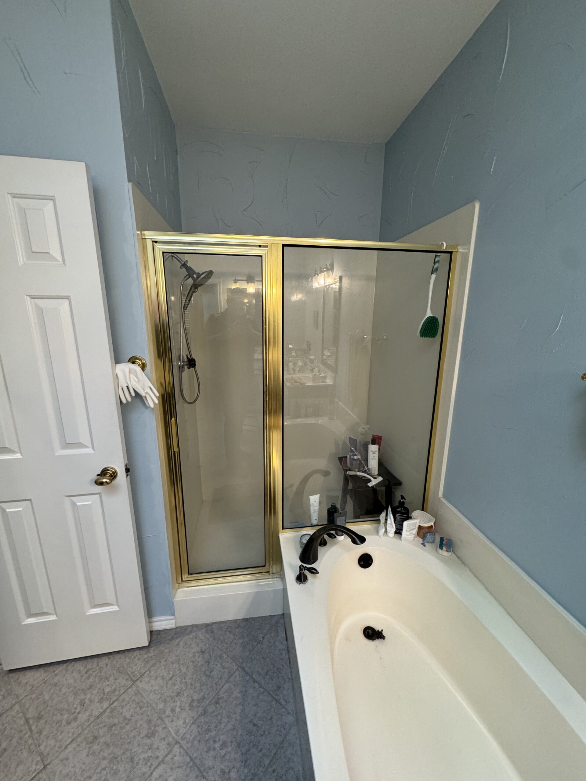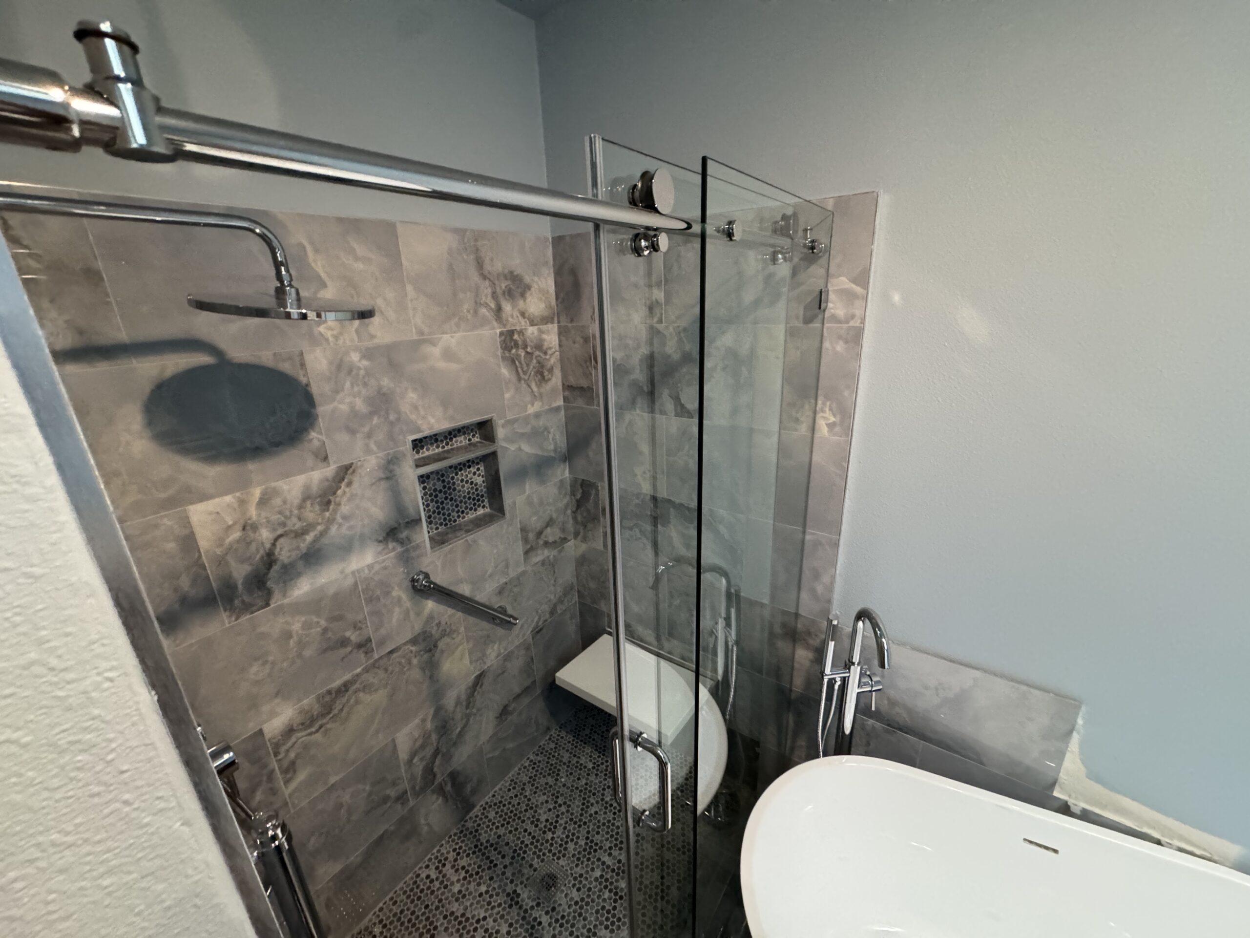 The client selected a beautiful tile combination for both the shower and tub surround, tying together soft blue and gray tones that give the space a bright, calming feel. We removed the original shower enclosure and rebuilt the shower using large-format tile and mosaic flooring, then installed a modern glass system to open up the room visually.