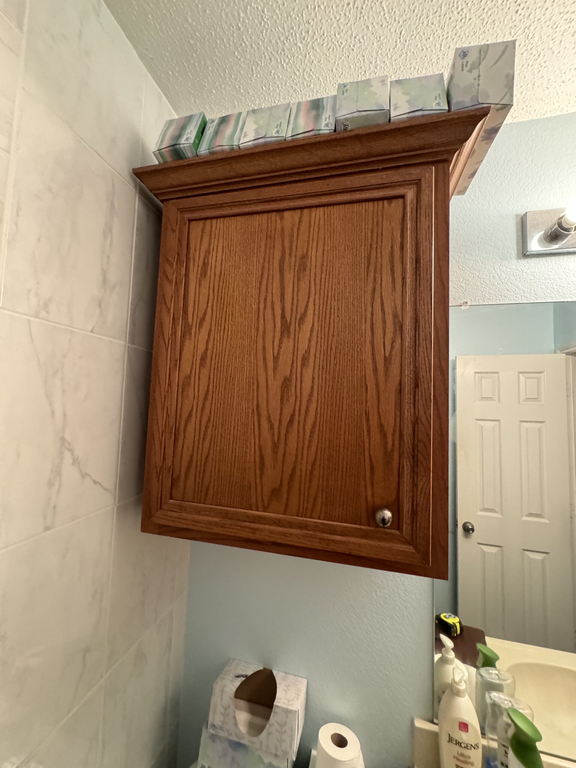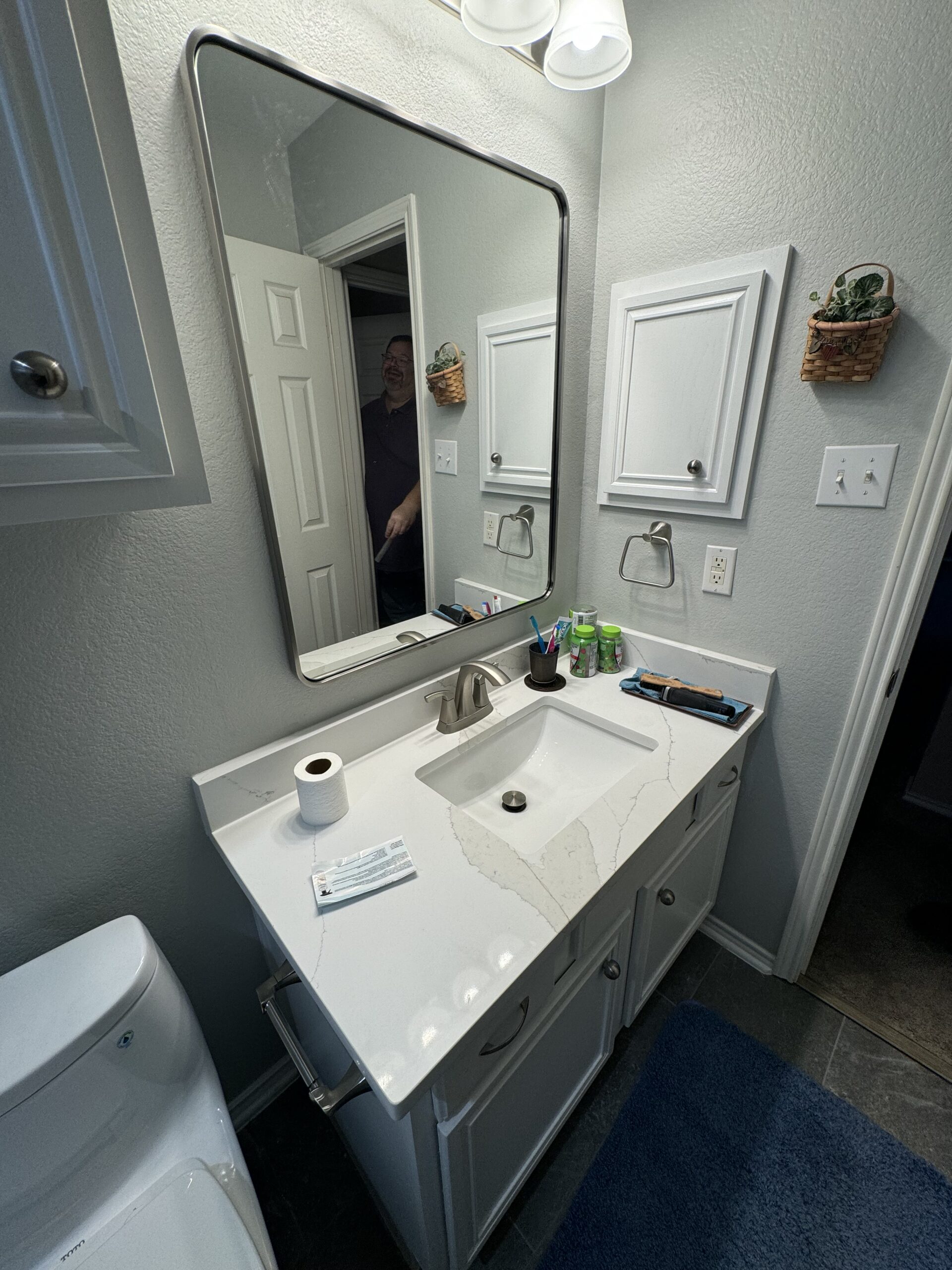Outside the shower, we painted the vanity and the cabinet above the toilet, installed quartz countertops, and updated all fixtures, mirrors, and accessories to create a cohesive, refreshed look.