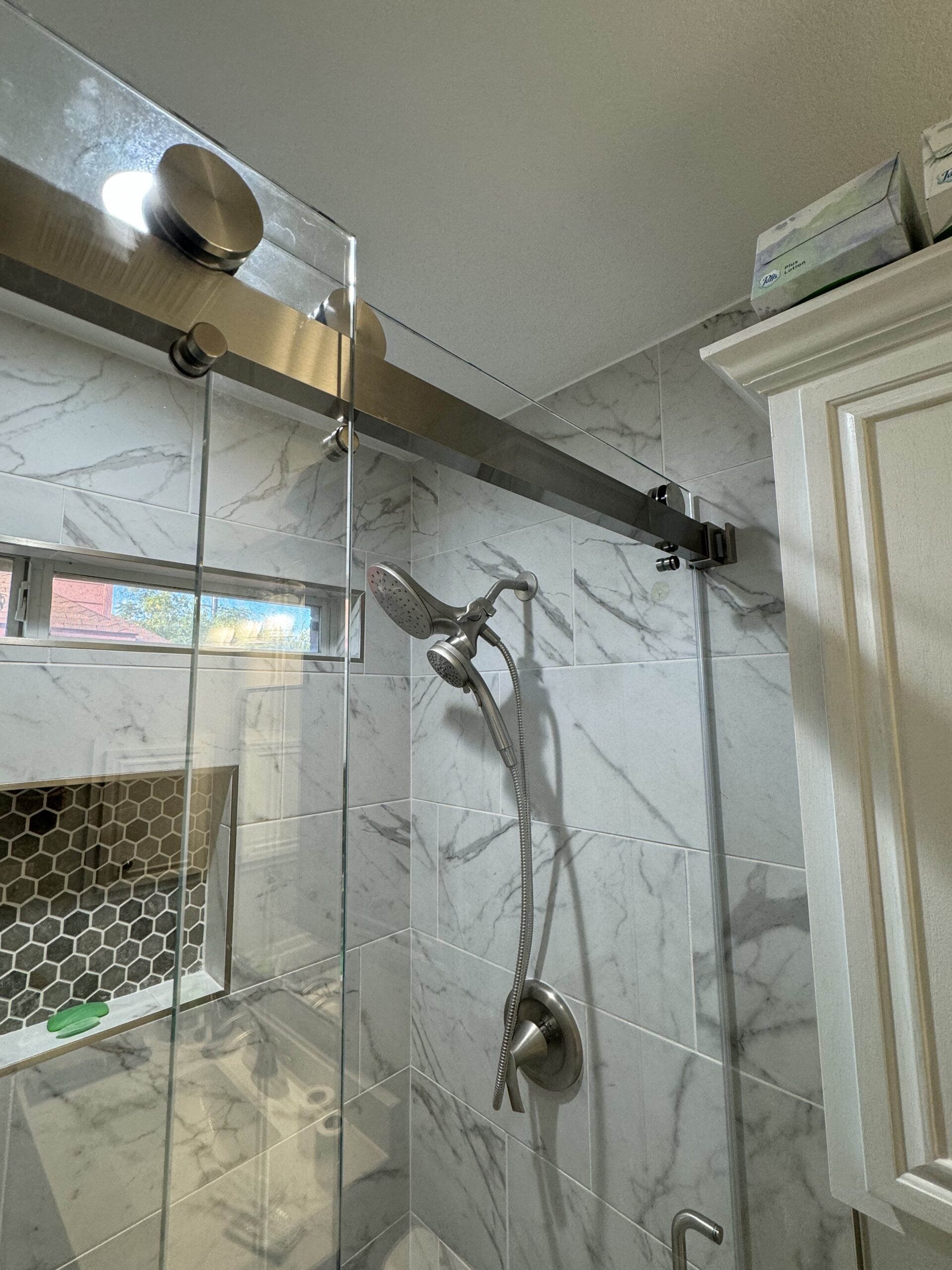 We began by addressing the shower enclosure, removing the original walled opening that made the space feel cramped. Opening the wall allowed us to fully enclose the shower with glass, immediately improving both sightlines and usability.