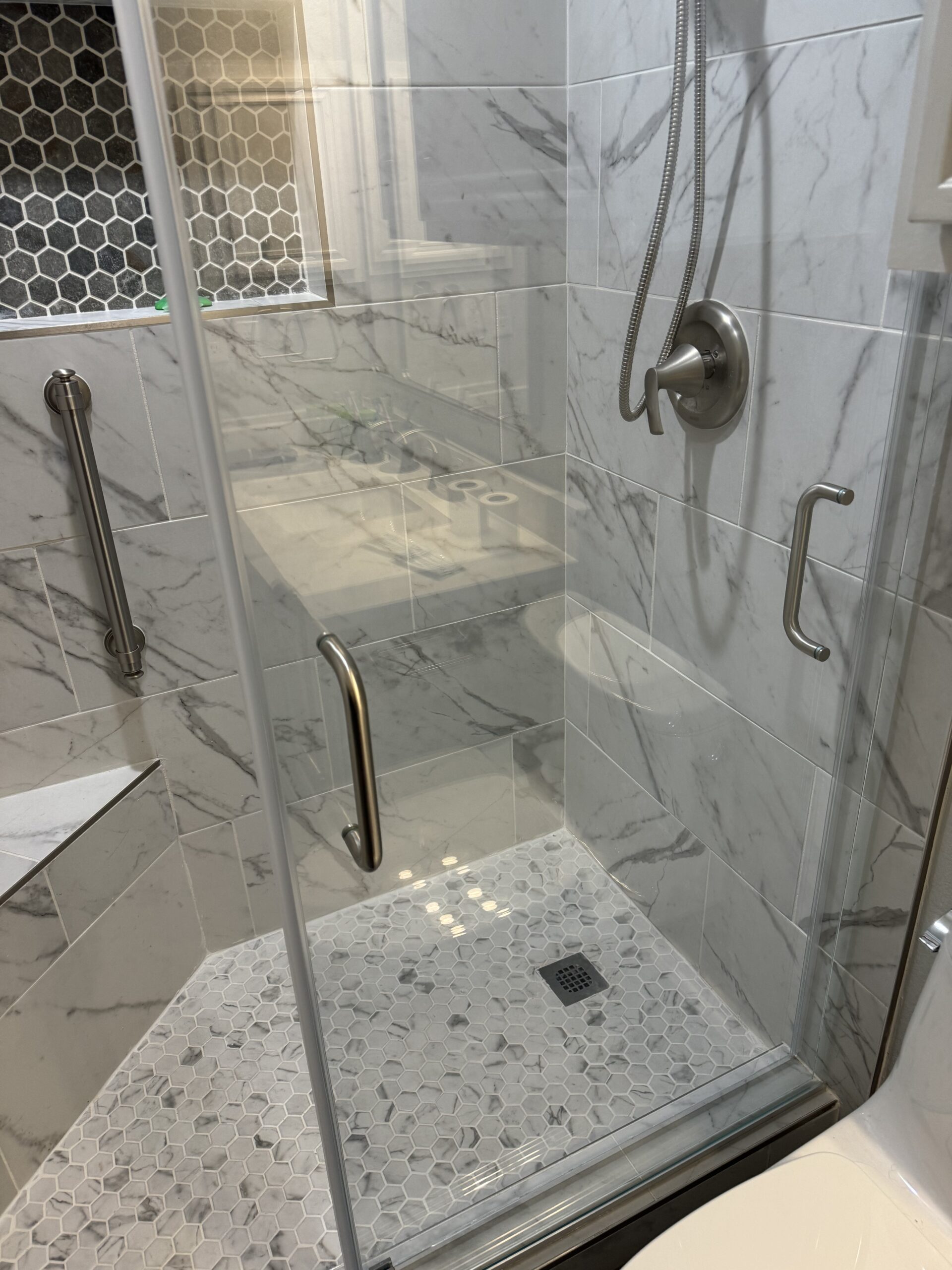 A built-in shower bench was added for comfort and functionality, along with new wall and floor tile. Double sliding glass doors were installed to create a clean, modern enclosure without overwhelming the room.