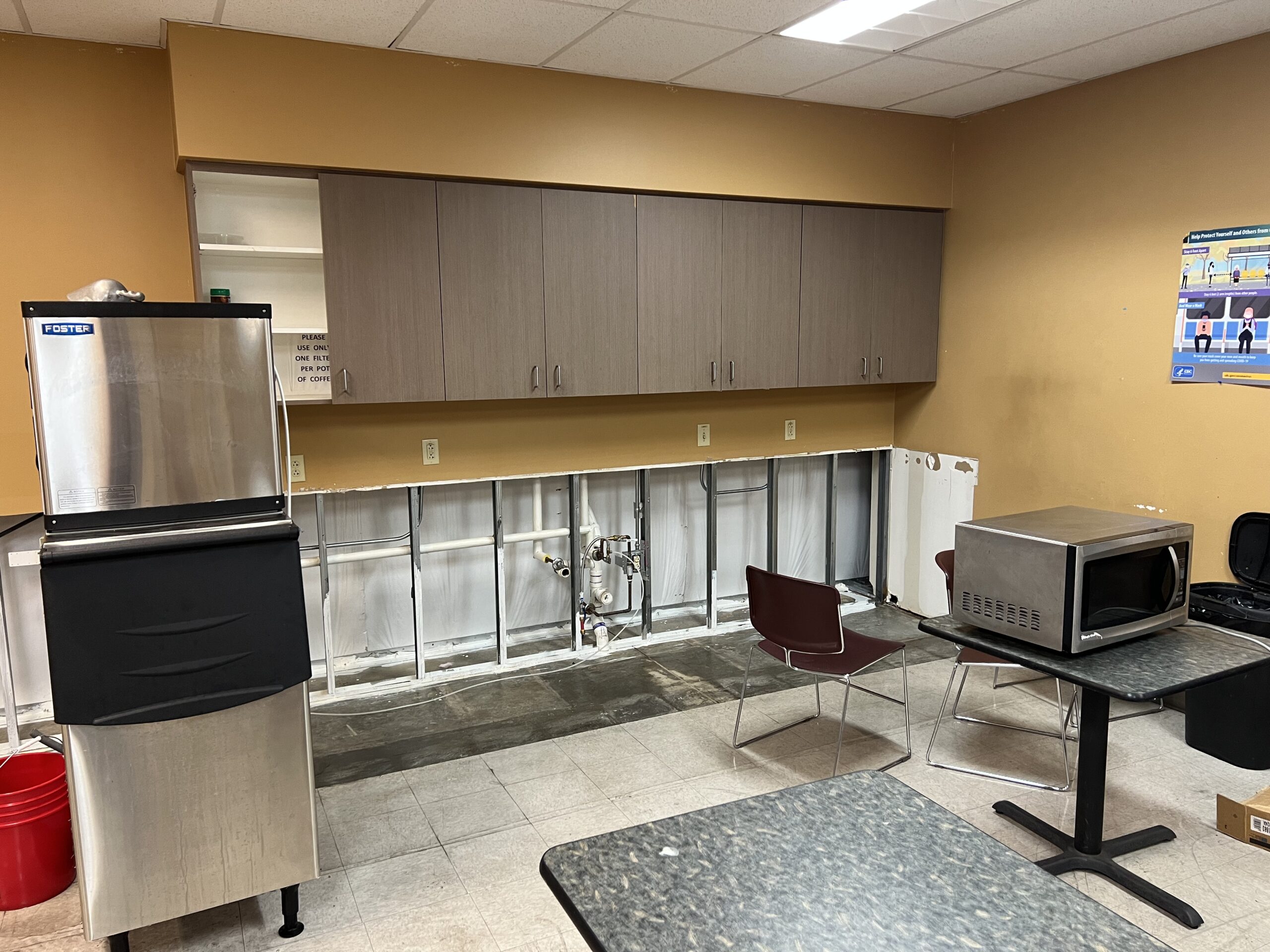 The primary challenge was addressing hidden water damage while minimizing disruption to the surrounding facility. Once damaged materials were removed, we rebuilt the space with moisture-resistant finishes and a seamless epoxy floor designed for durability, easy maintenance, and long-term performance in a shared breakroom setting.