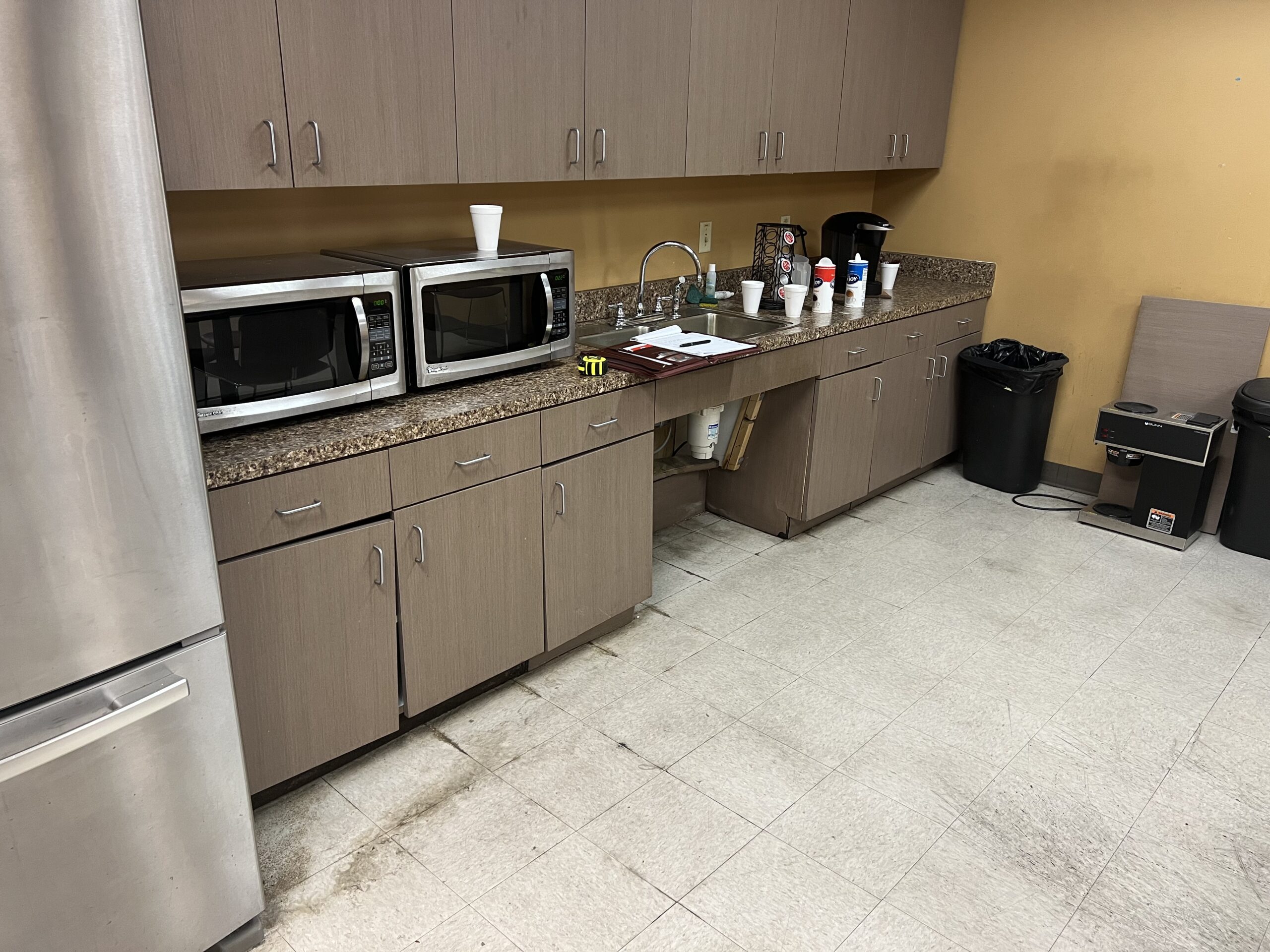 The completed breakroom is clean, functional, and built to handle daily use. The new epoxy flooring provides a durable surface, while the rebuilt countertop and refreshed finishes restore both usability and appearance to the space.
