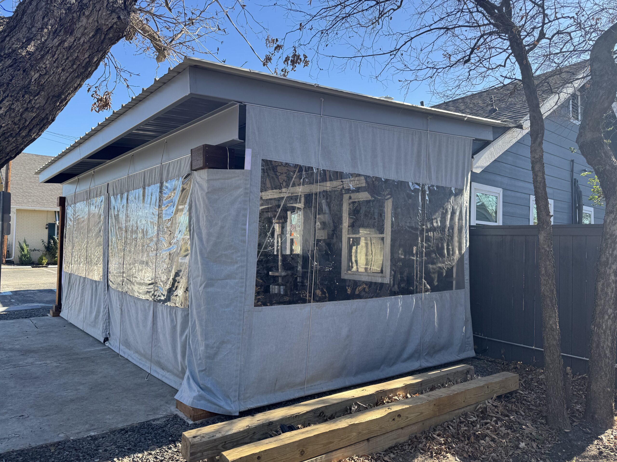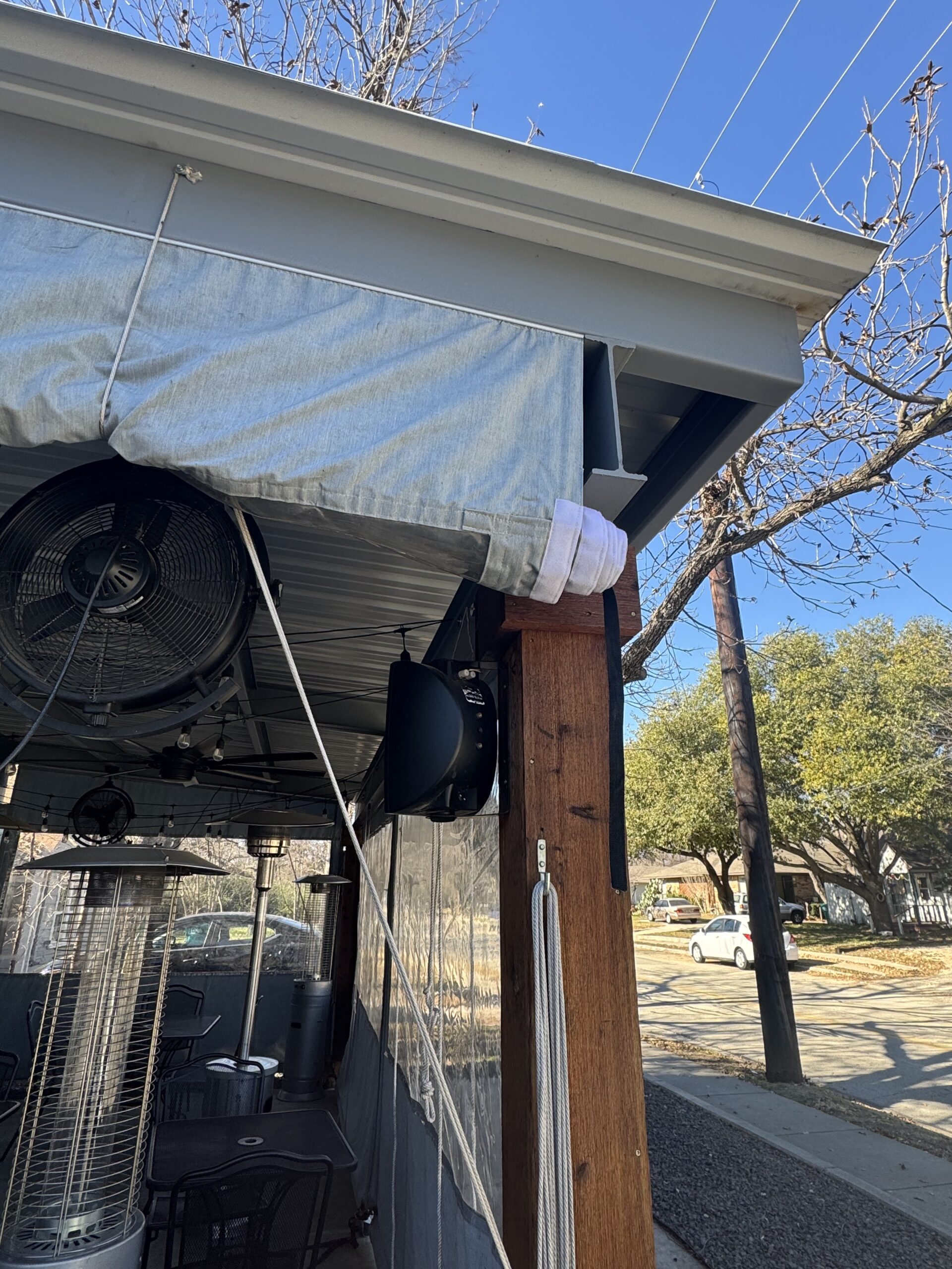 The finished patio maintains a clean, understated aesthetic that fits naturally with the restaurant’s exterior. Steel framing and properly placed structural supports provide long-term durability, while the low-profile roofline and enclosure system allow the patio to function comfortably across seasons.