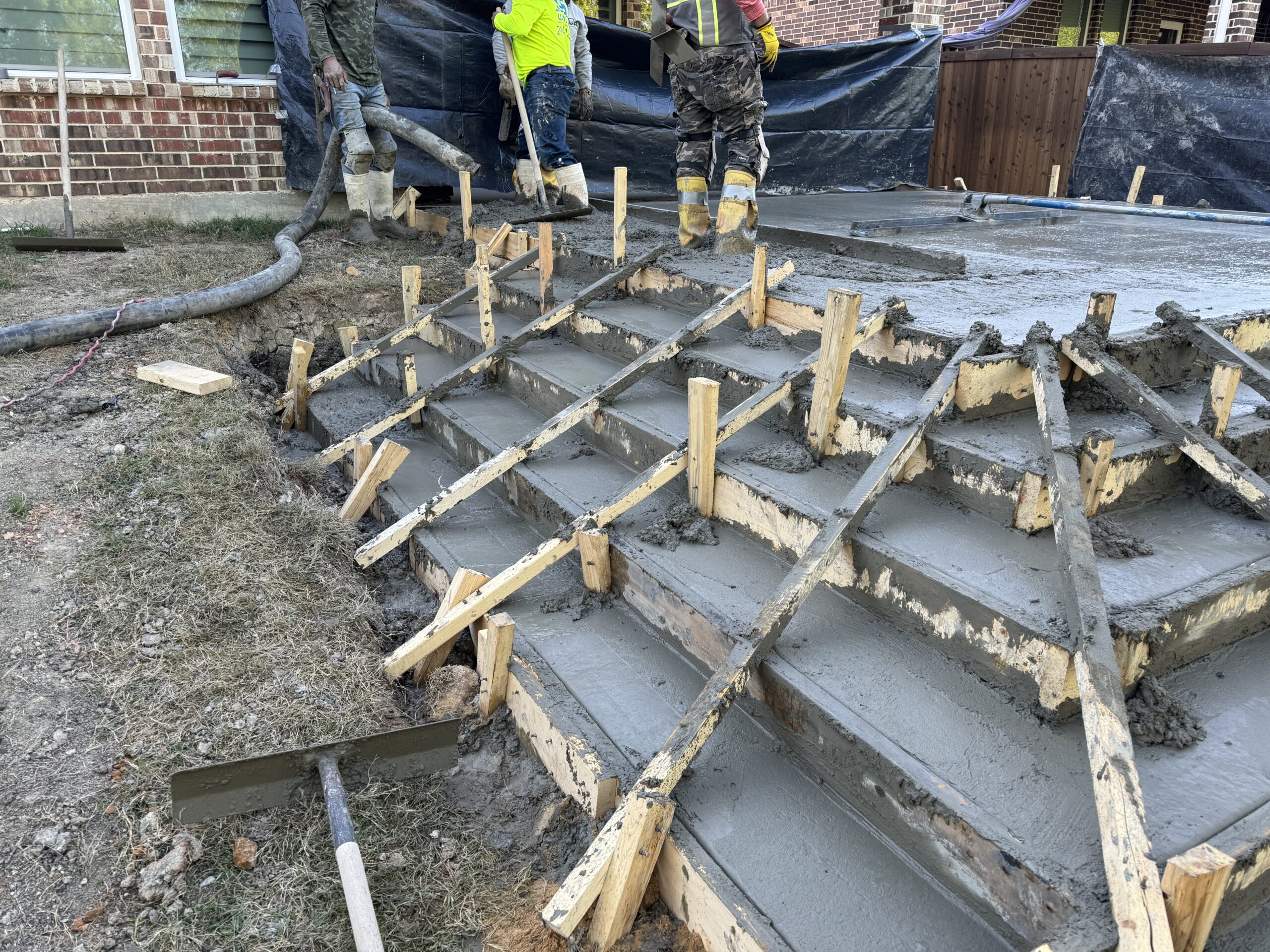 A large concrete patio in Rockwall designed to solve steep grading challenges while creating a safe, accessible outdoor space for all ages.