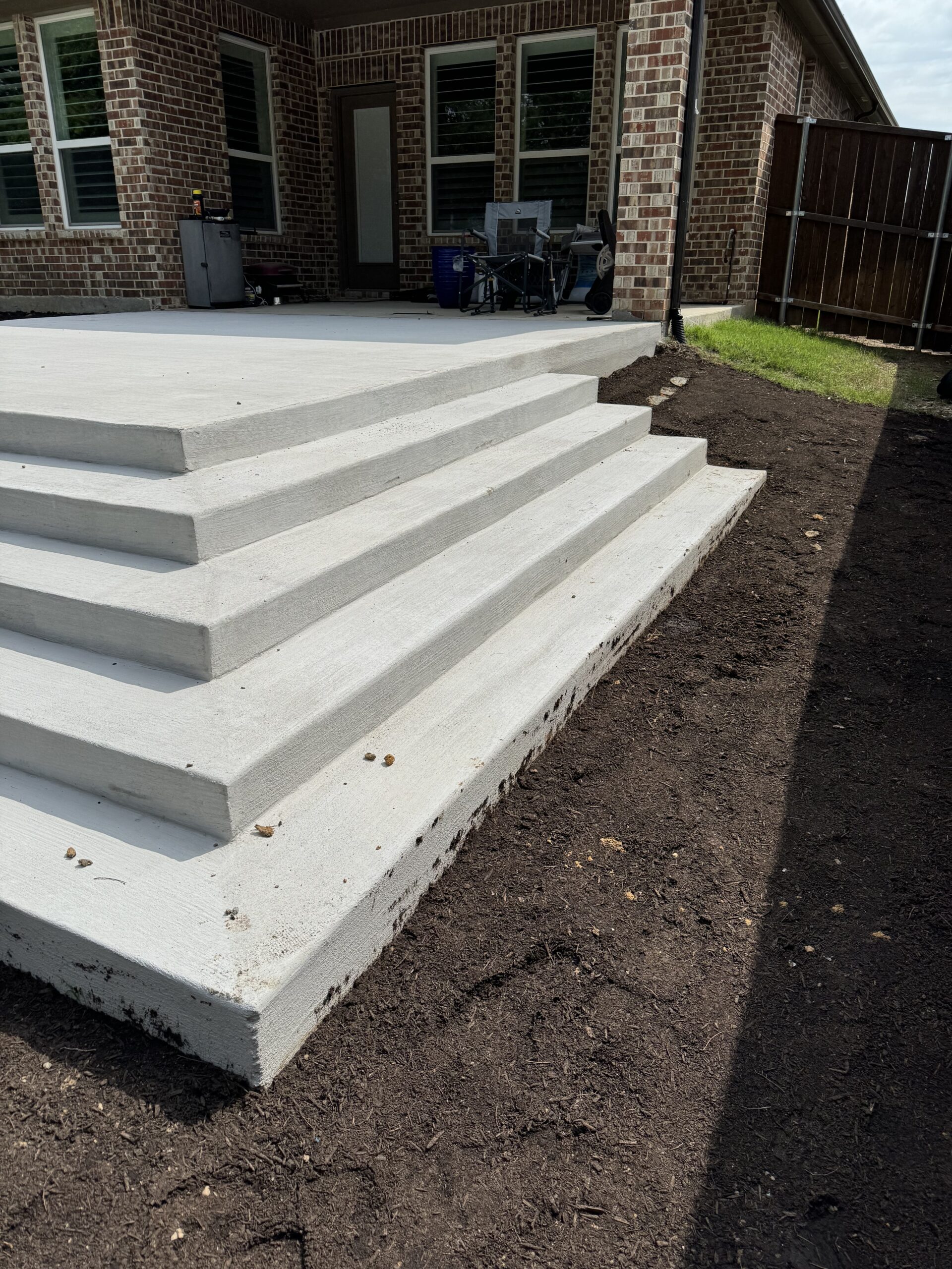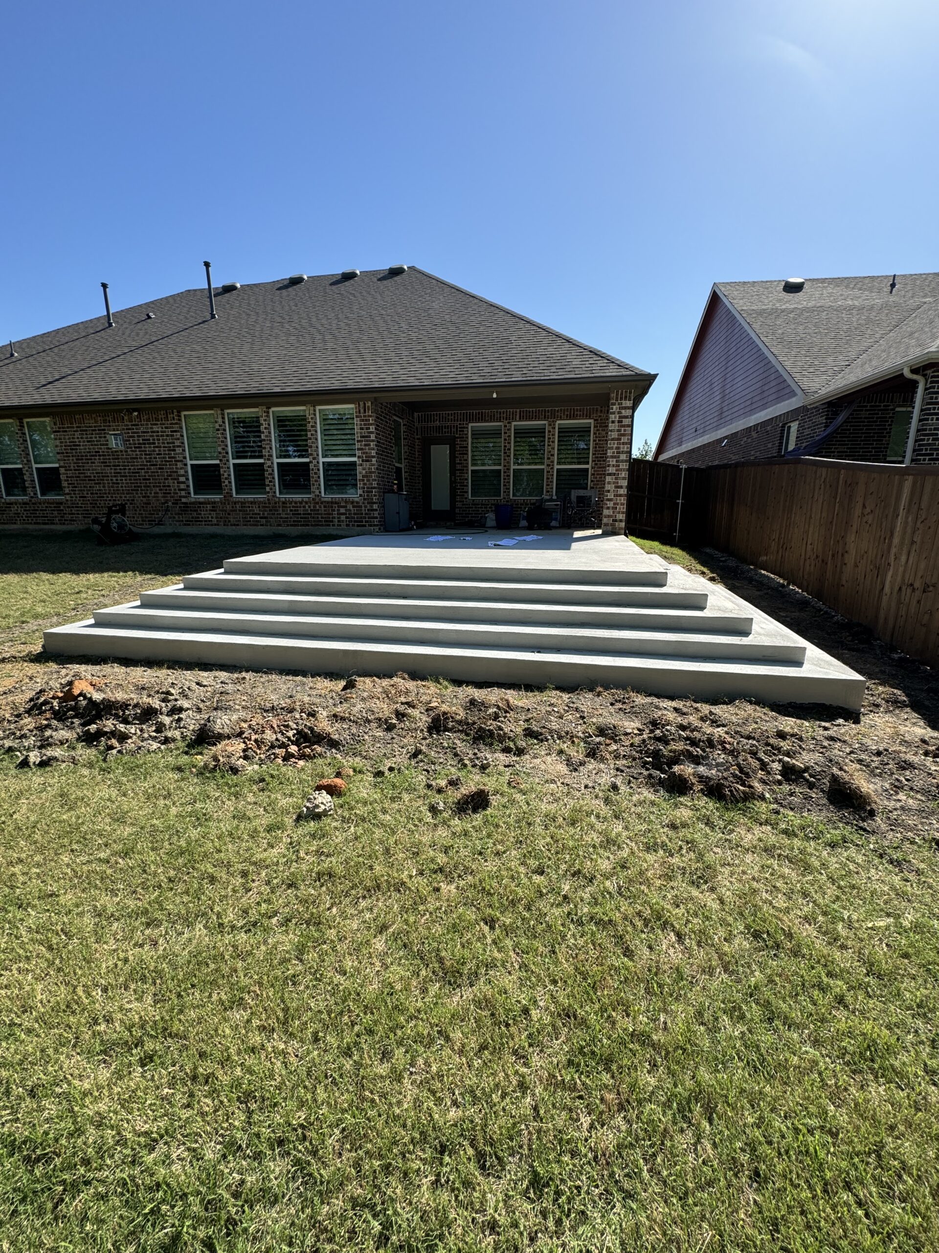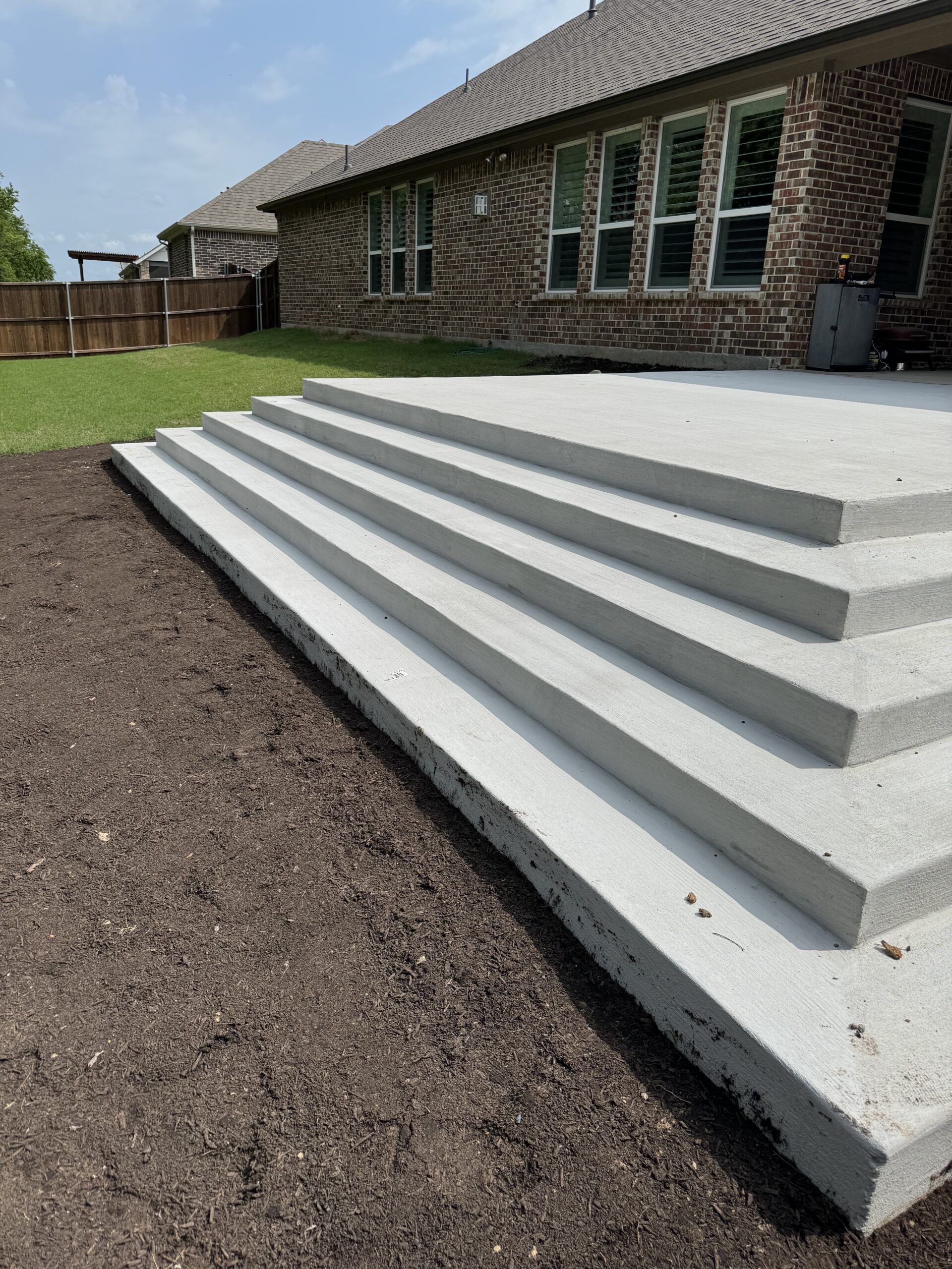 This Rockwall, TX backyard presented a significant elevation change that limited how the space could be safely used. The homeowners wanted a large, open concrete patio that felt substantial and permanent, but also remained accessible for grandchildren and elderly family members.