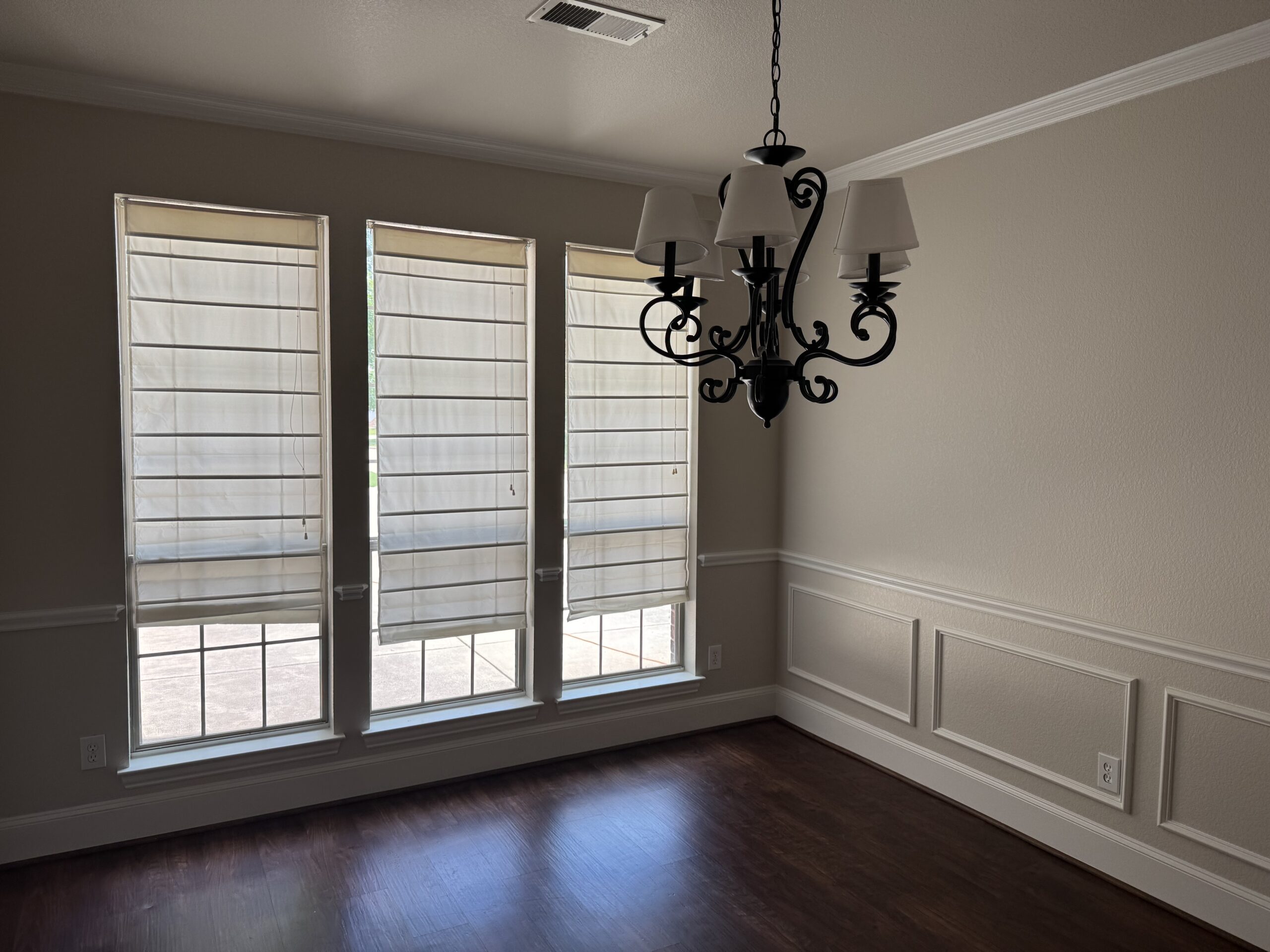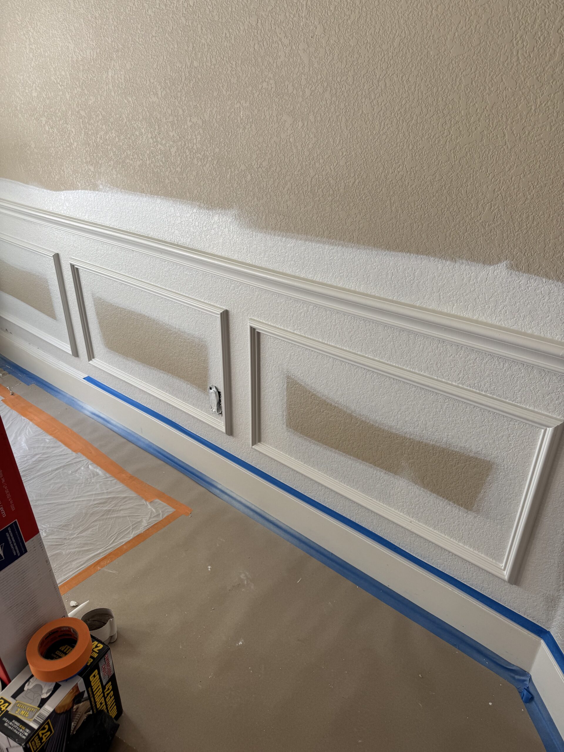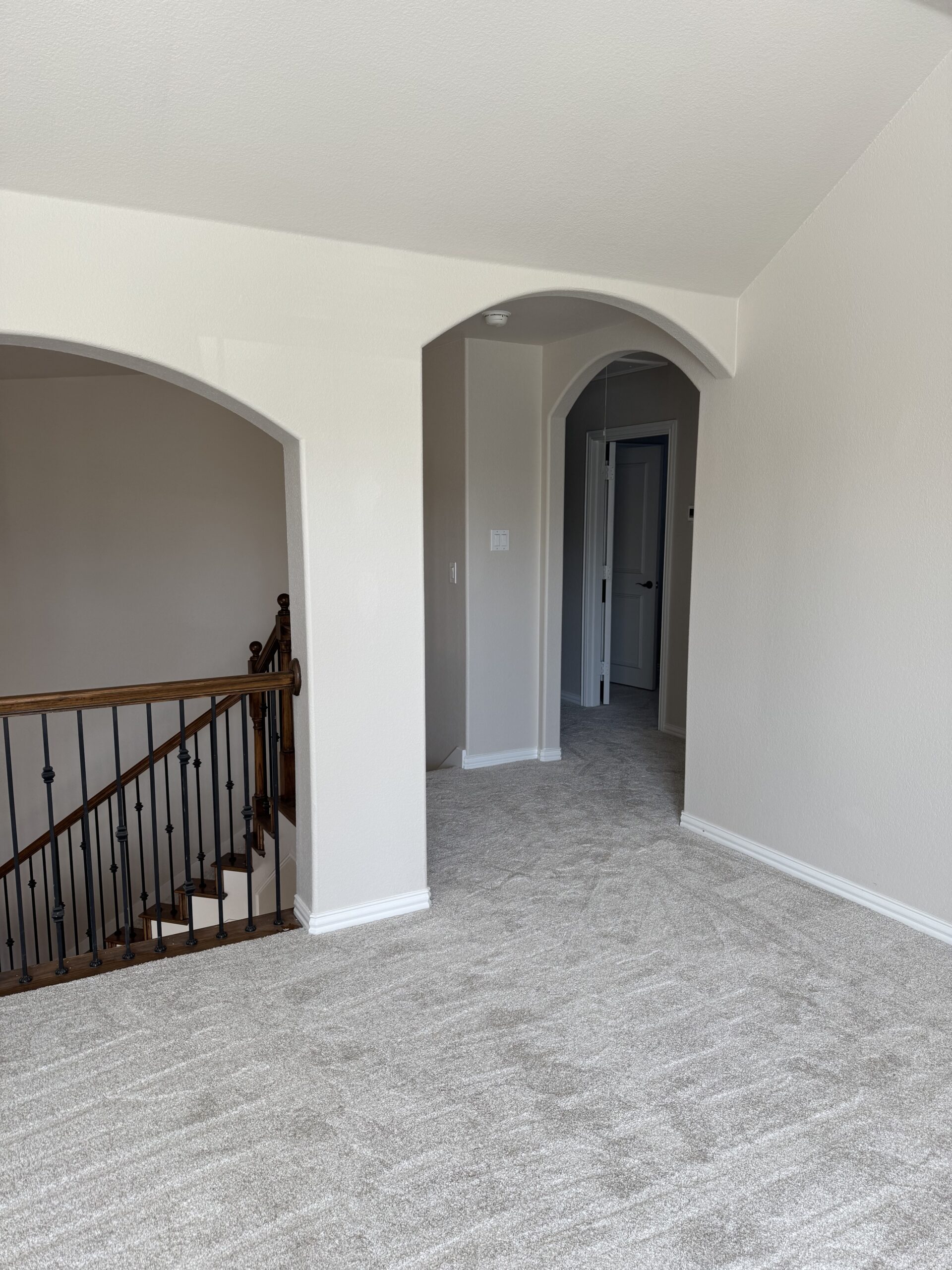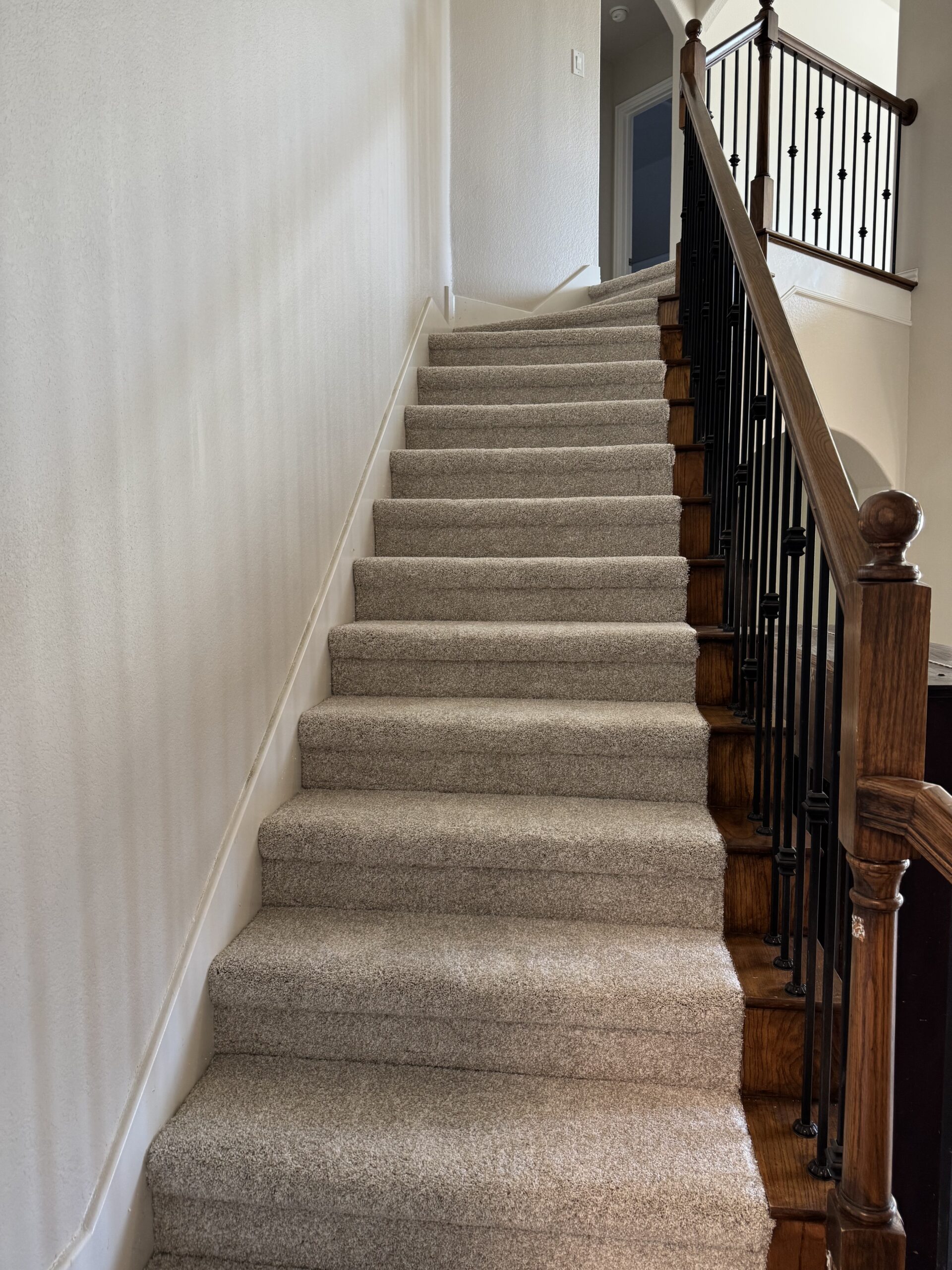 Our team also completed a full interior paint package covering walls, ceilings, trim, doors, and decorative wall features. Minor sheetrock touchups were completed prior to painting to ensure smooth, consistent finishes. Existing hardwood stair treads and railings were carefully protected while carpet was installed on the stairs for a clean transition between floors.