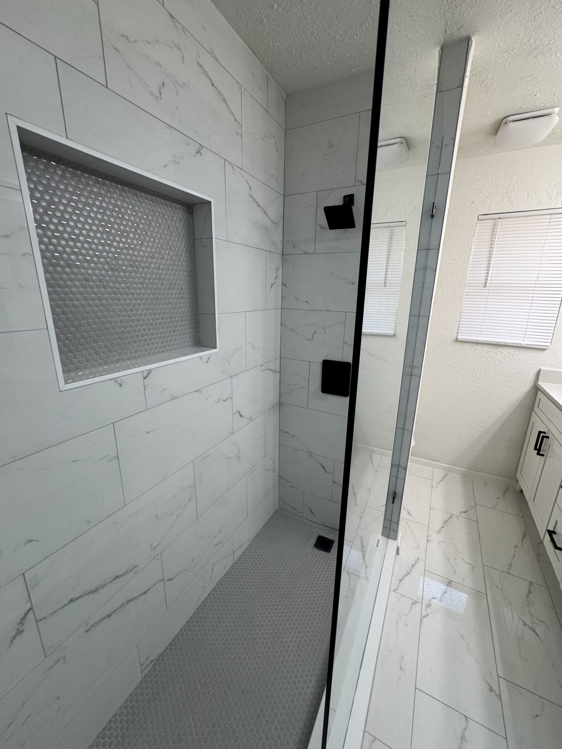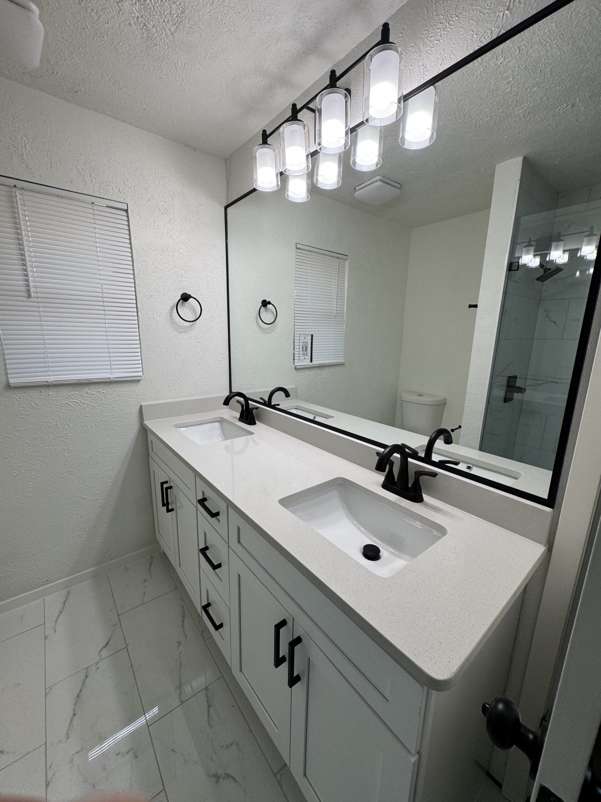 Two full bathroom remodels with new tile, vanities, fixtures, and lighting