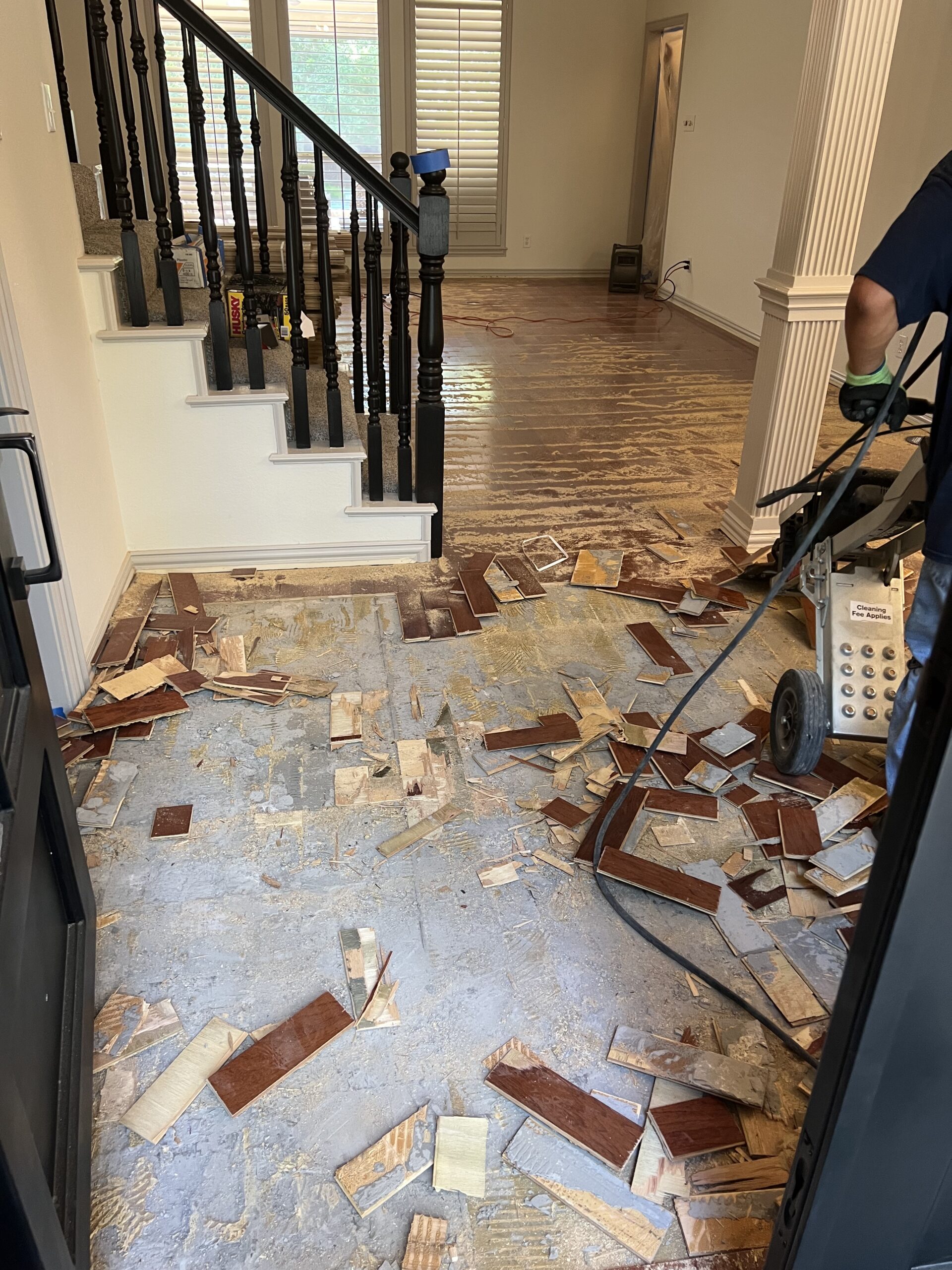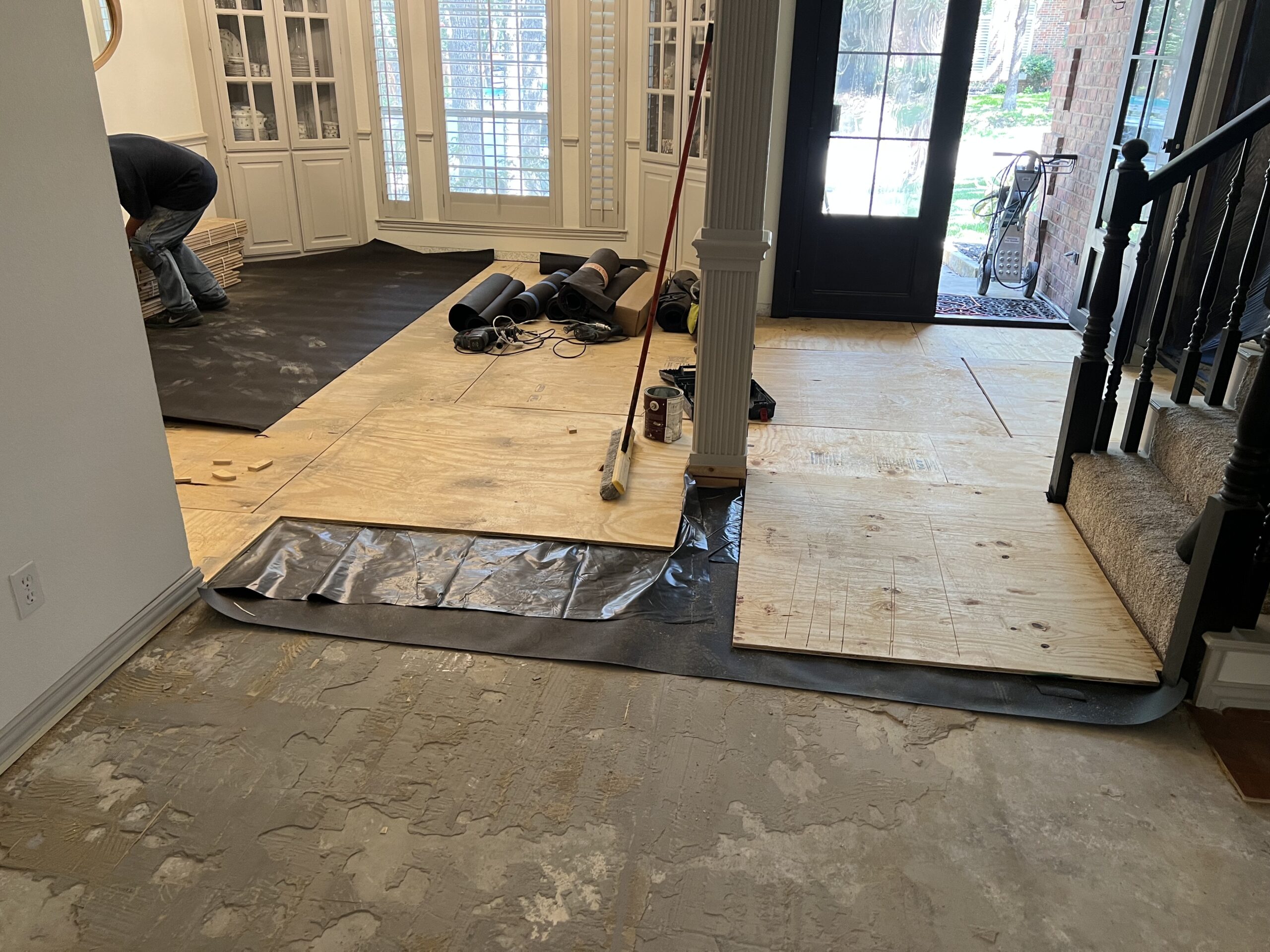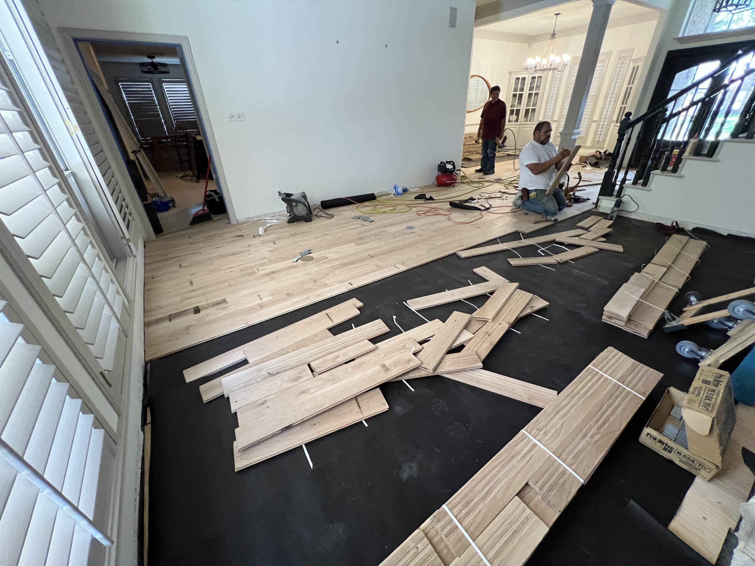 We began by delivering the white oak flooring early so it could properly acclimate to the home’s environment. Once acclimated, we removed the existing flooring and prepared the subfloor with a vapor barrier to protect the new hardwood.