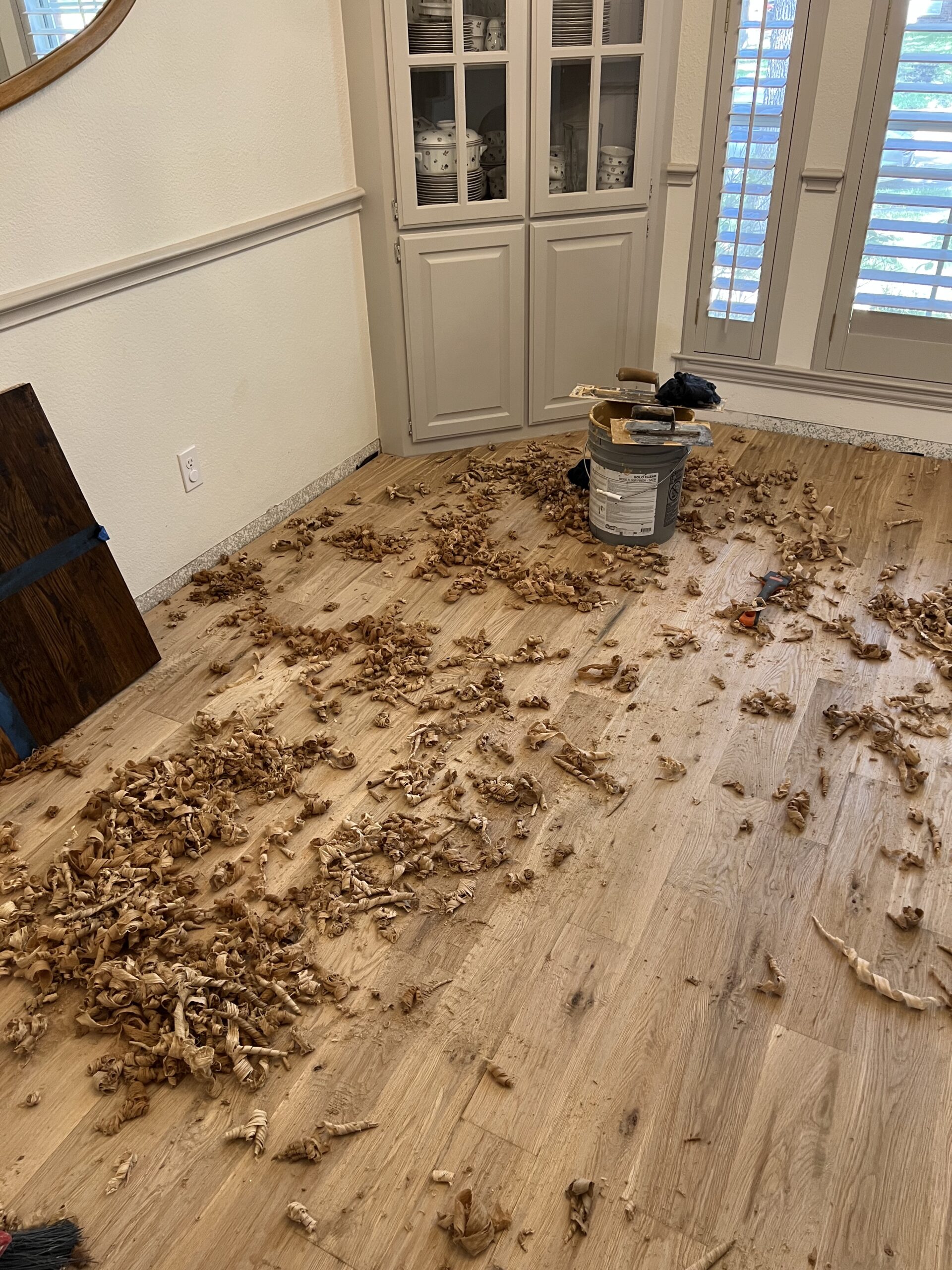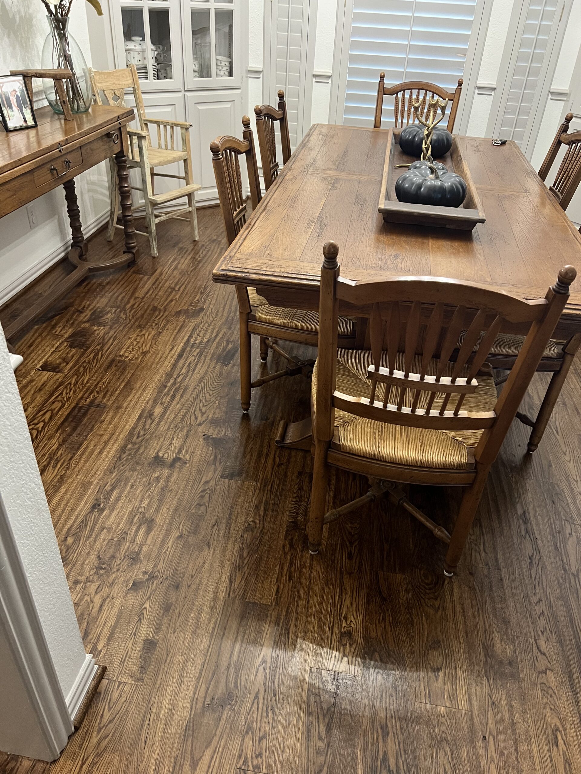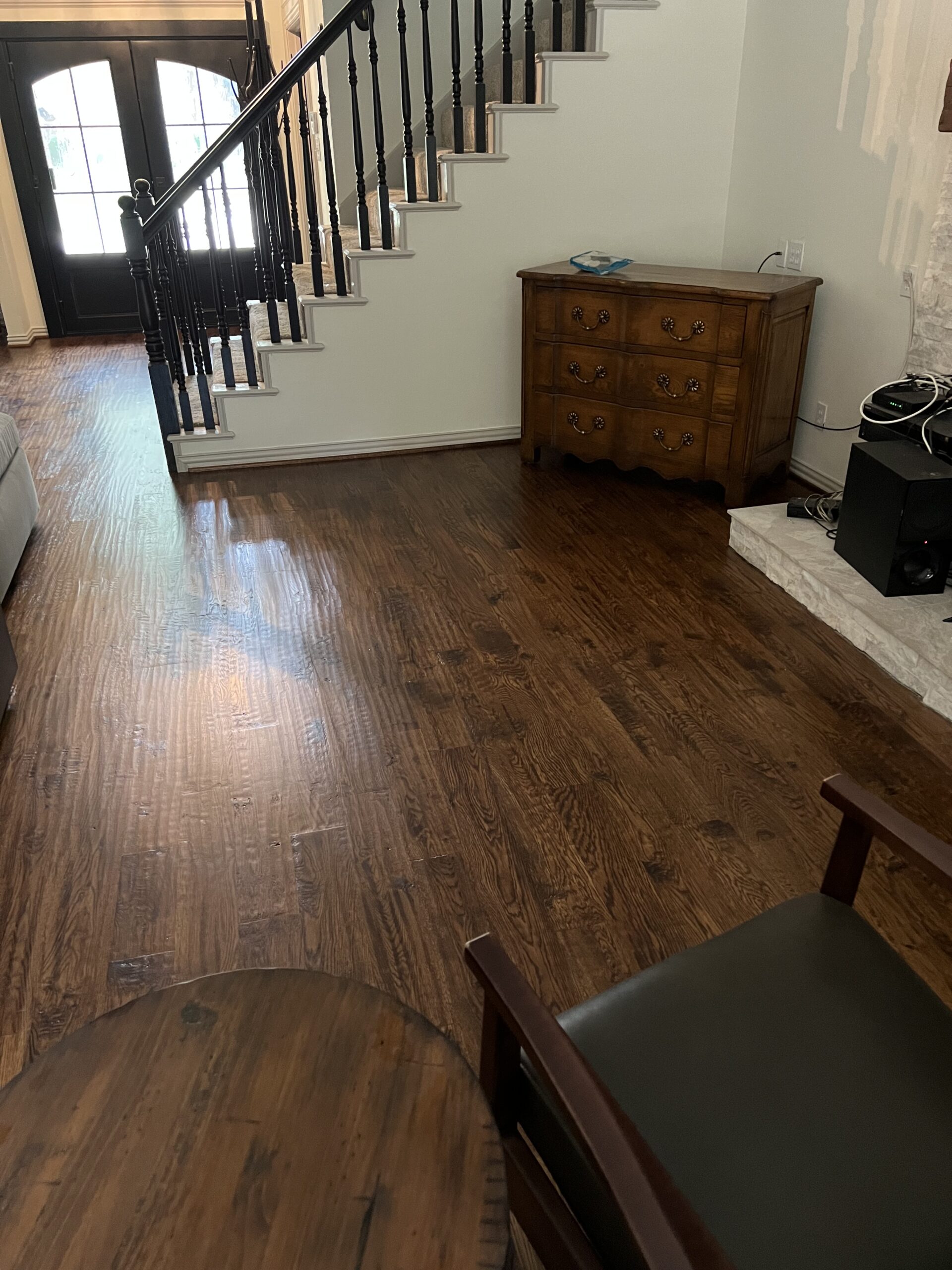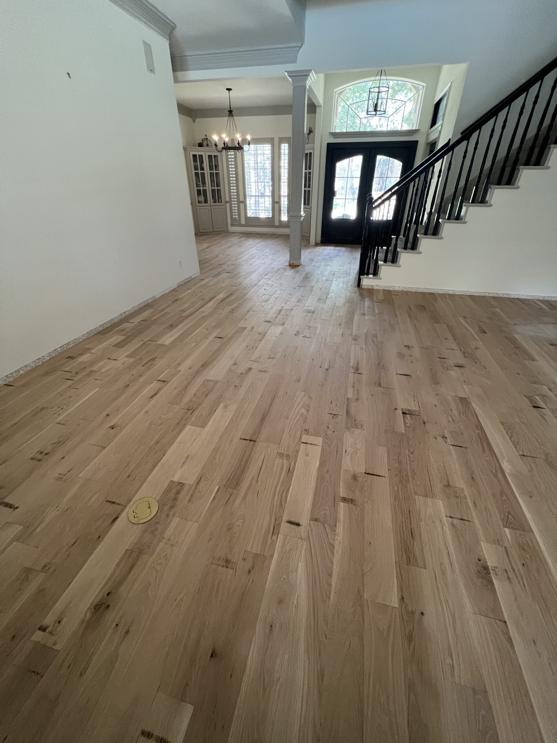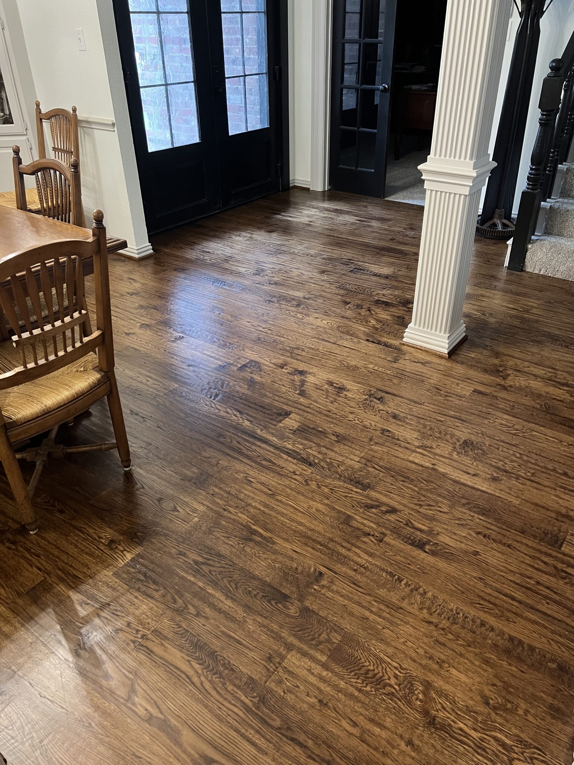 This Keller home received a full genuine white oak hardwood floor replacement, transforming dated red-toned flooring into a timeless, hand-scraped finish designed to age beautifully with a busy household (and a large, energetic dog).