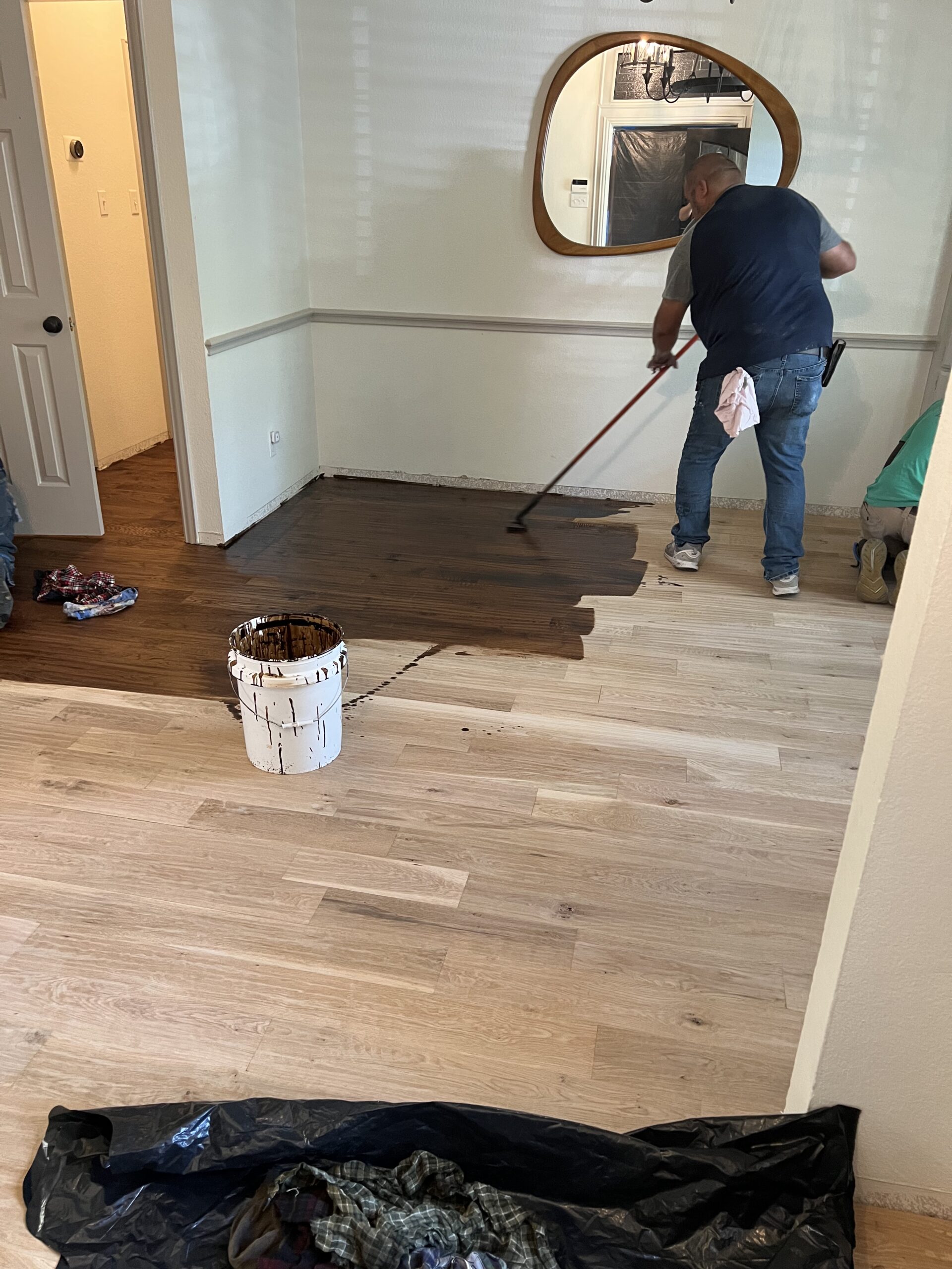 Rather than selecting stain colors in advance, we wait until the floor is installed so clients can view real stain samples directly on the actual wood. This allows them to see how each option performs in different lighting conditions throughout the home.