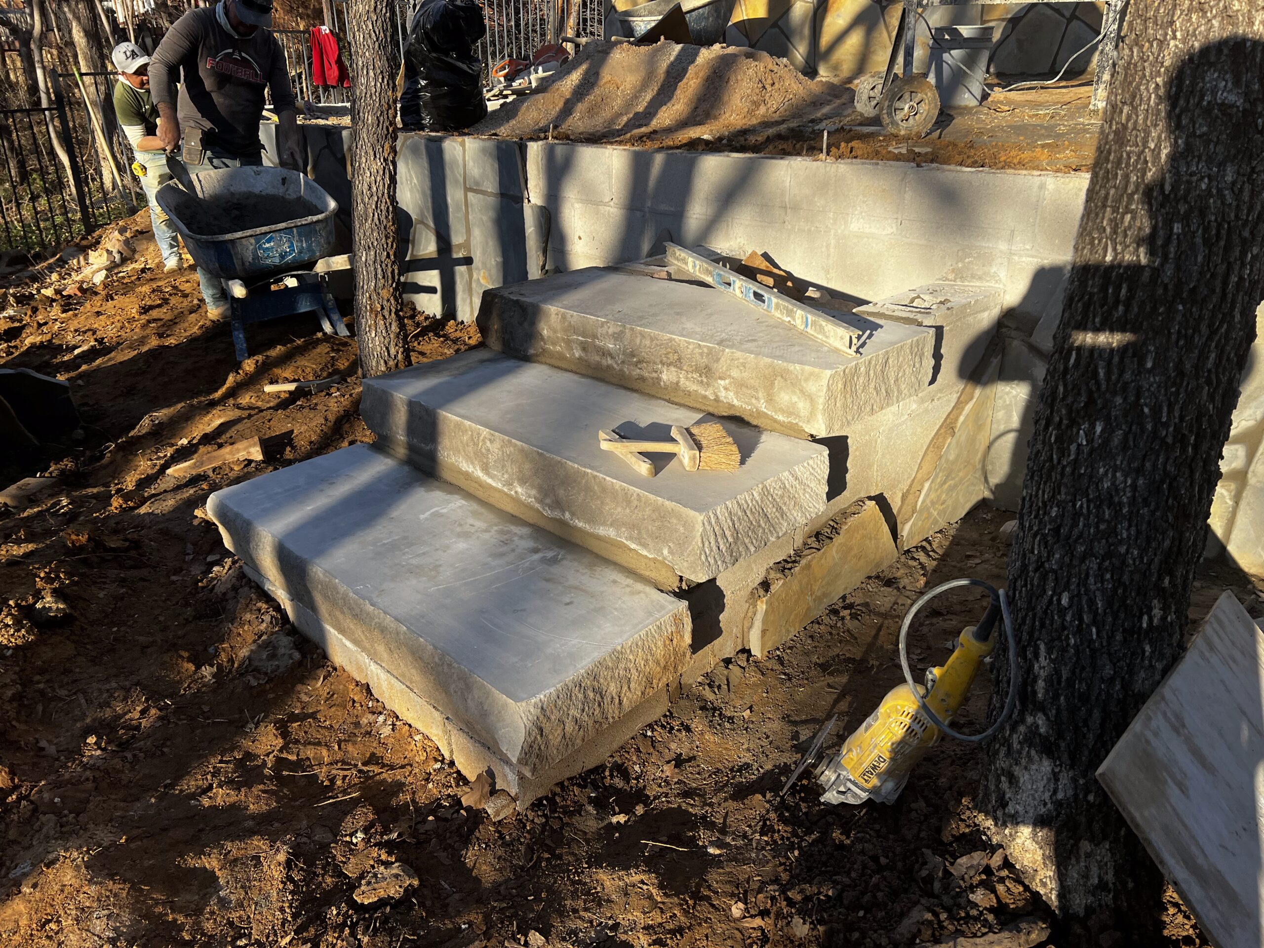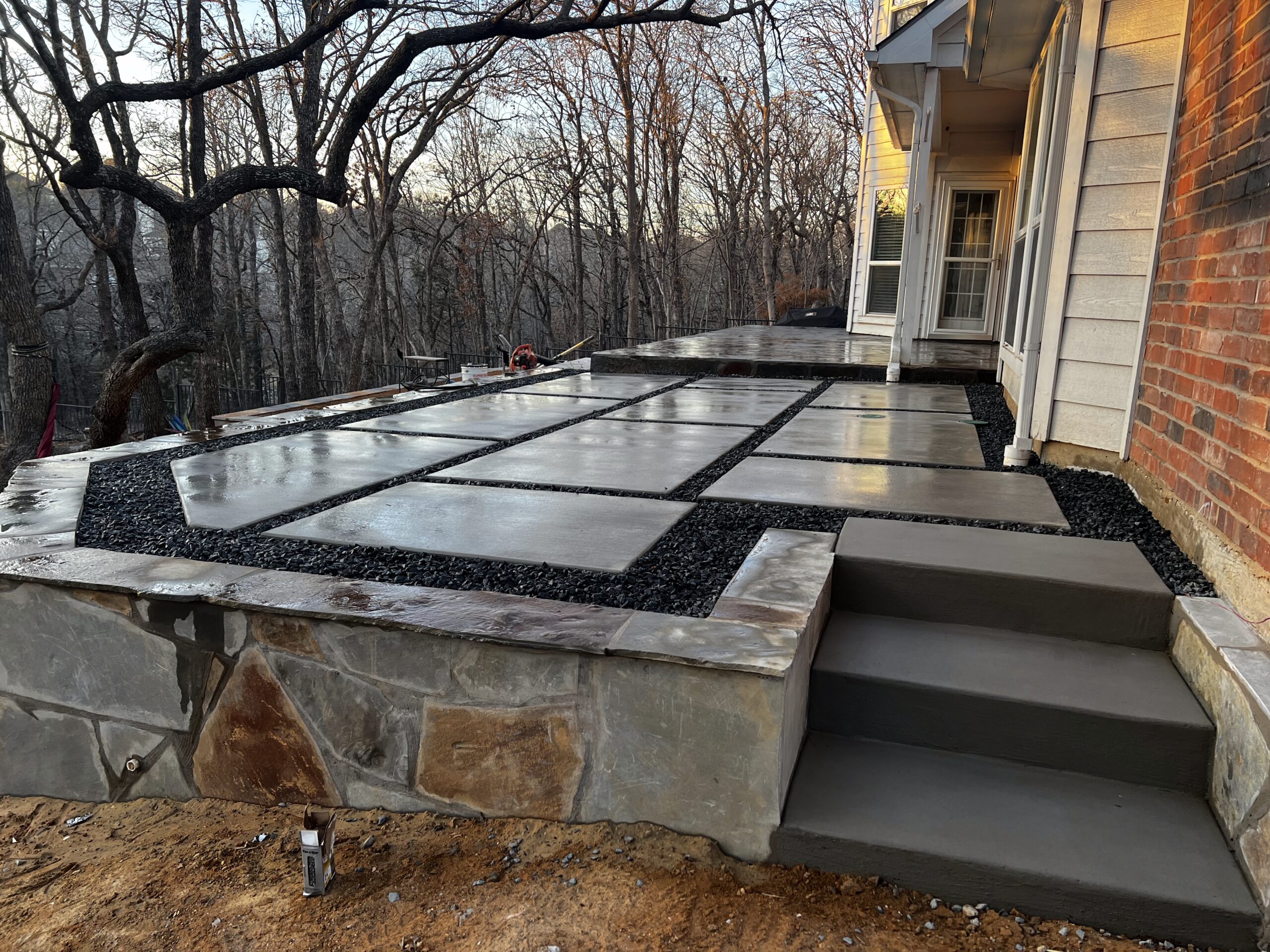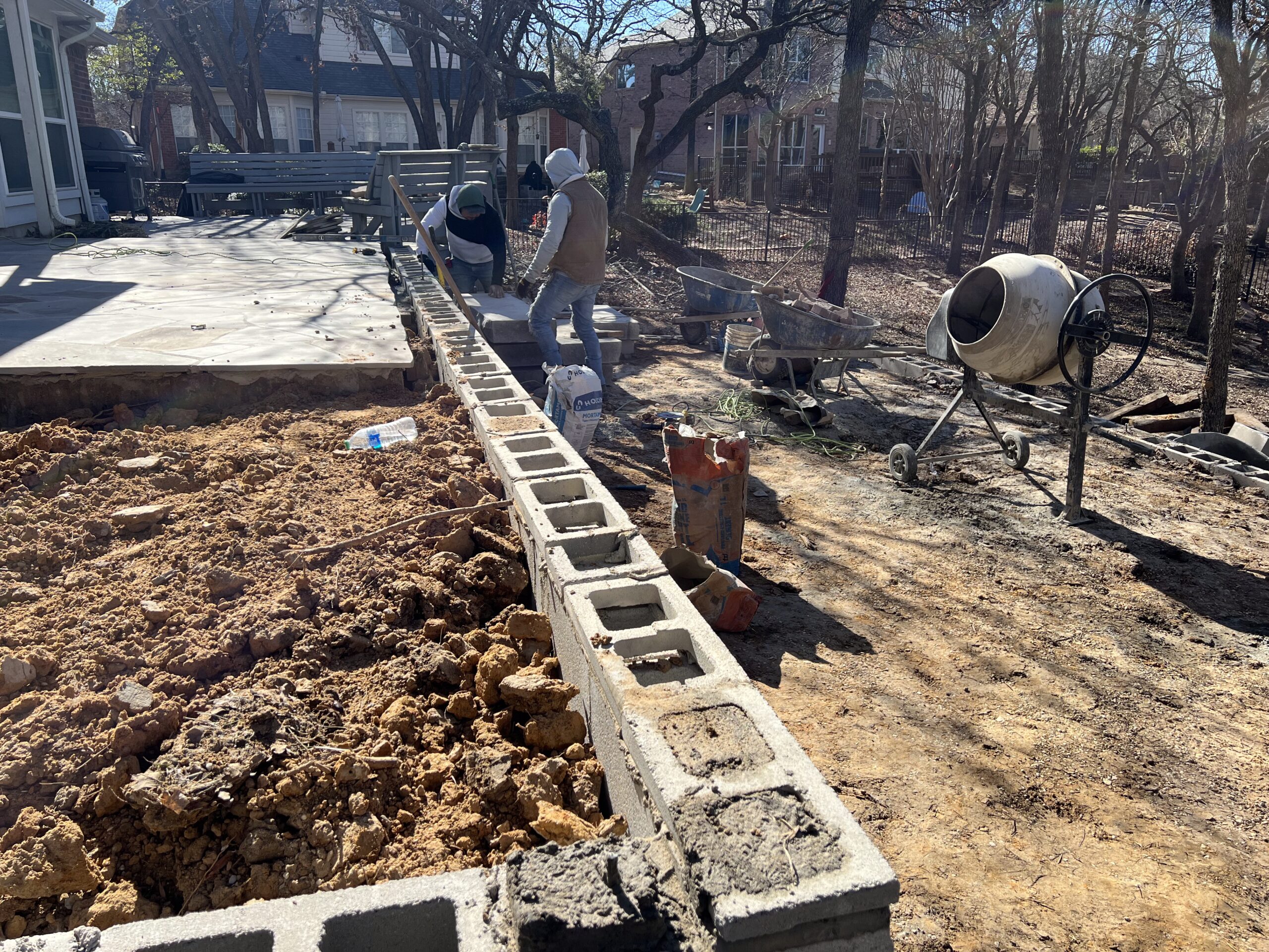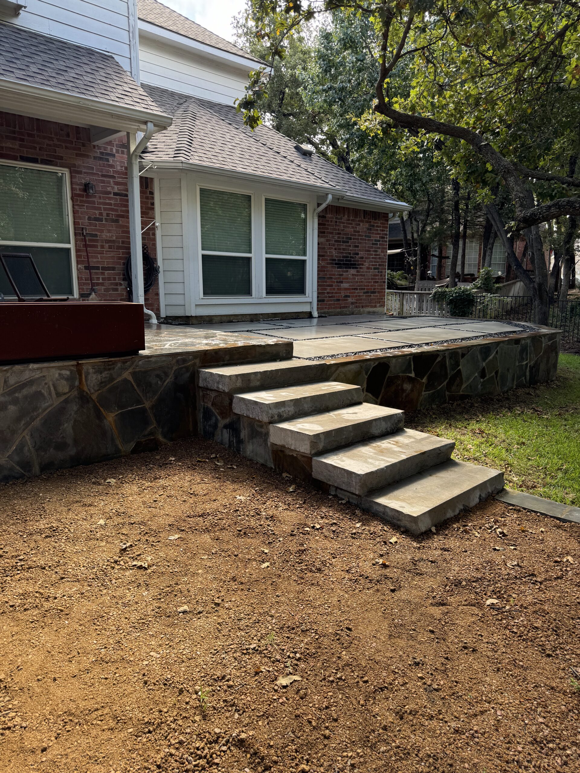 A complete backyard transformation in Highland Village, Texas. This project replaced an aging wood deck with a custom hardscape design featuring concrete pavers, natural stone retaining walls, Lueders limestone steps, and decomposed granite gathering areas – creating a functional, multi-level outdoor space built for entertaining and everyday use.