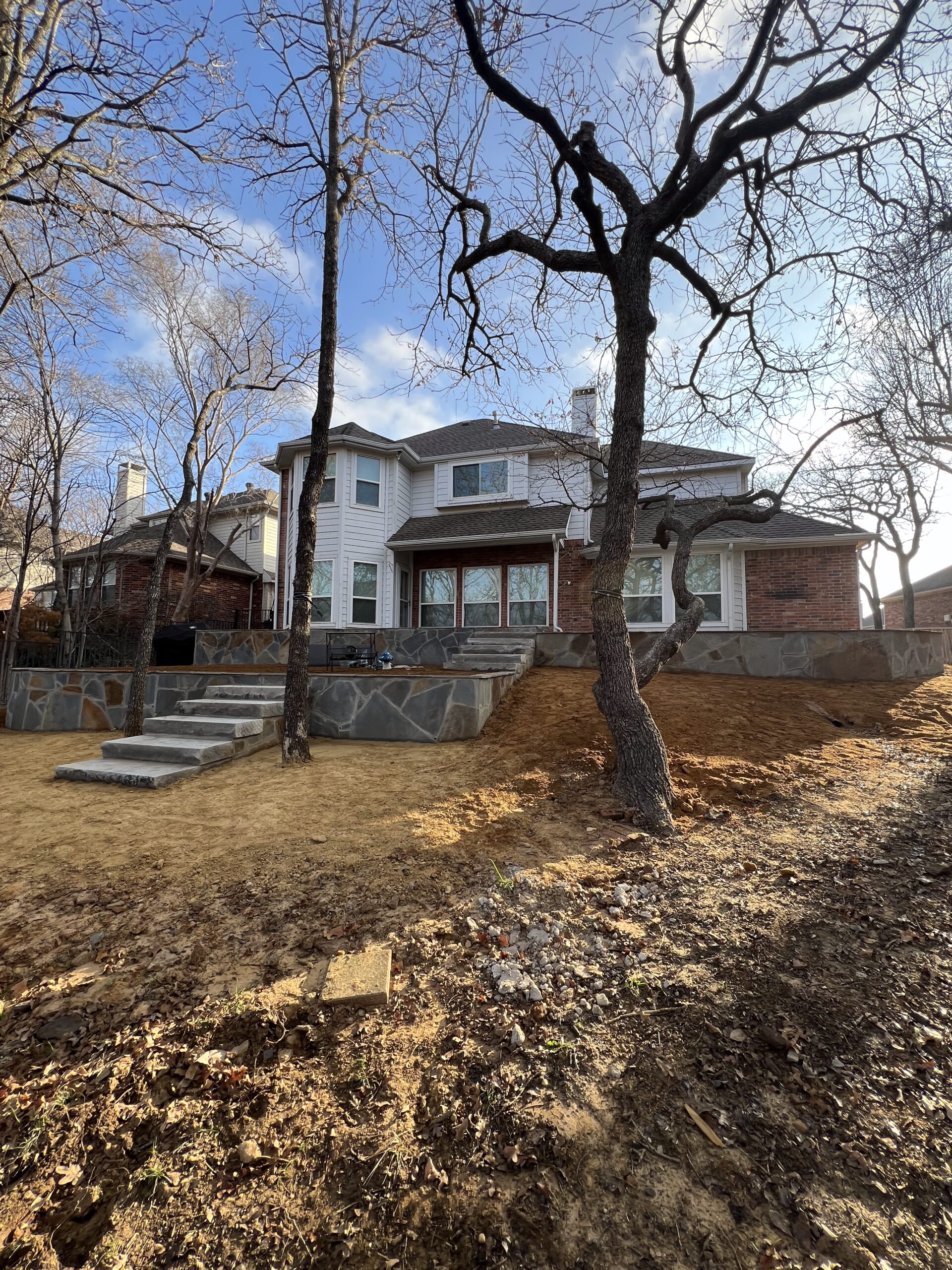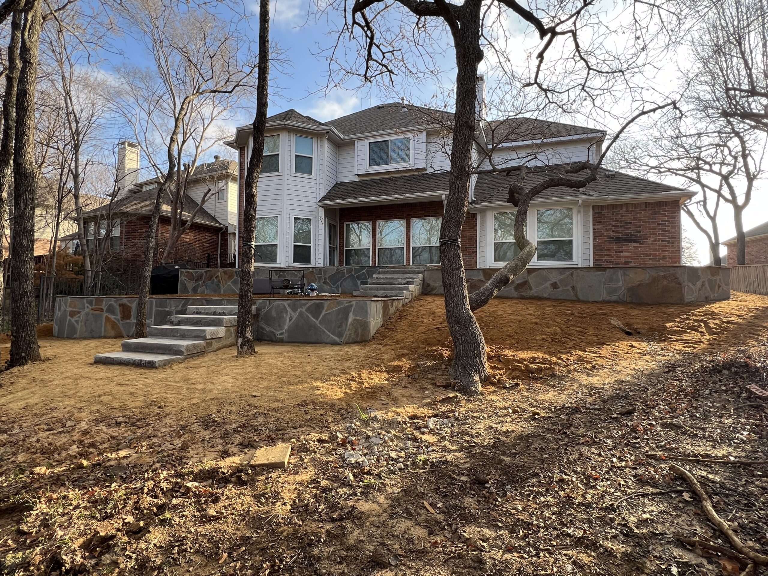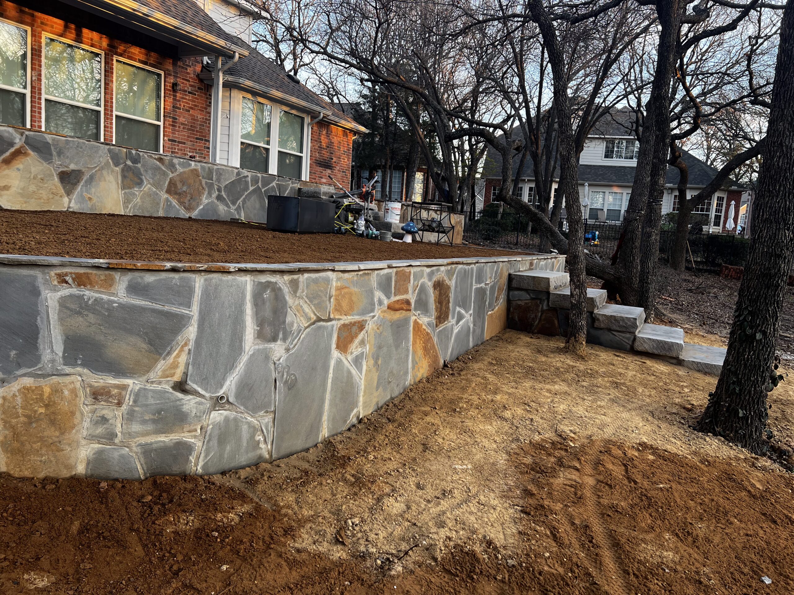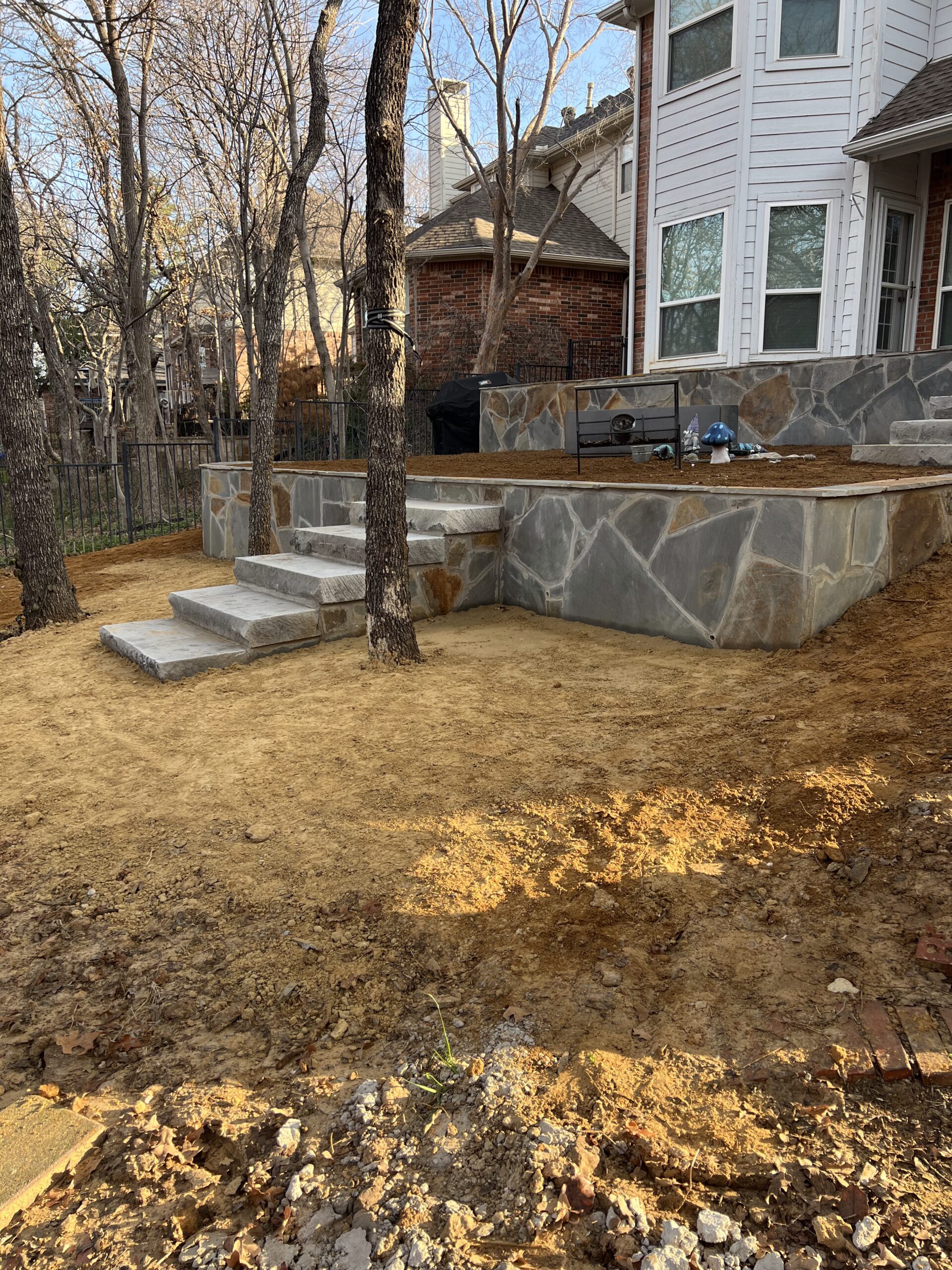 We began by demolishing the original wood deck and regrading the yard to create multiple usable levels. New stone retaining walls were built using a flagstone aesthetic to match the home’s existing patio, giving the entire backyard a cohesive look.