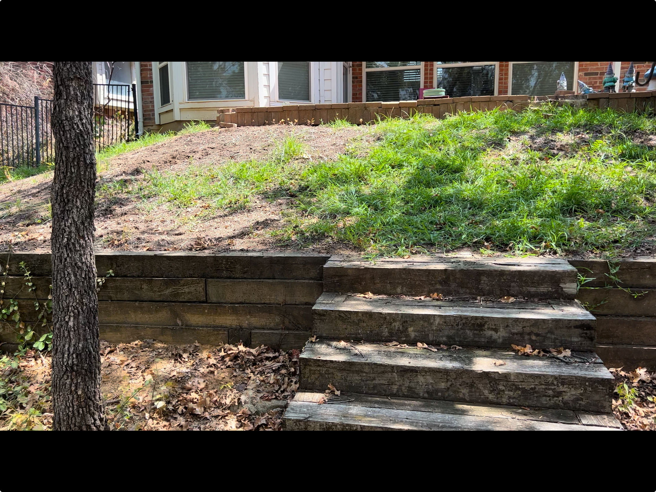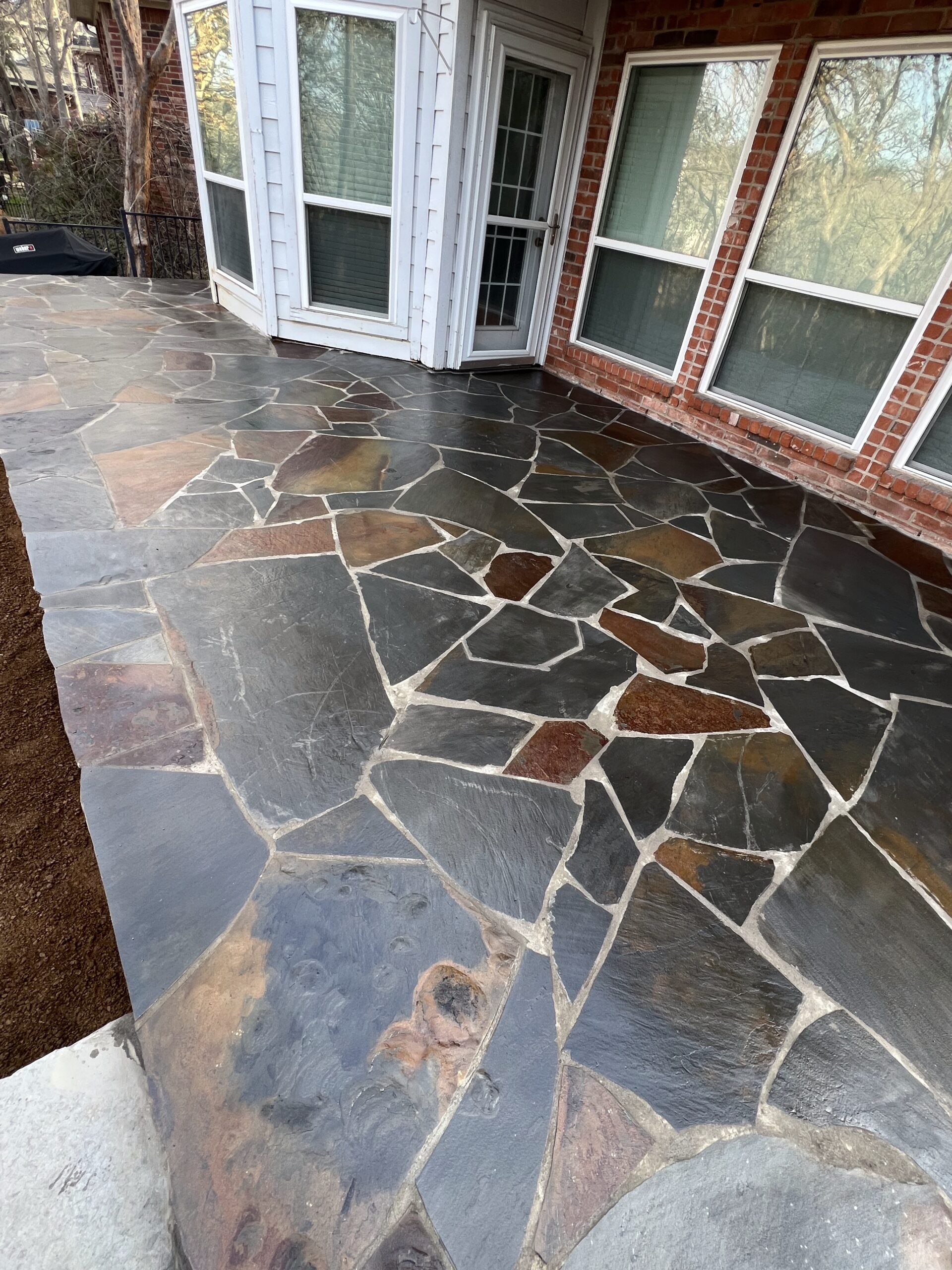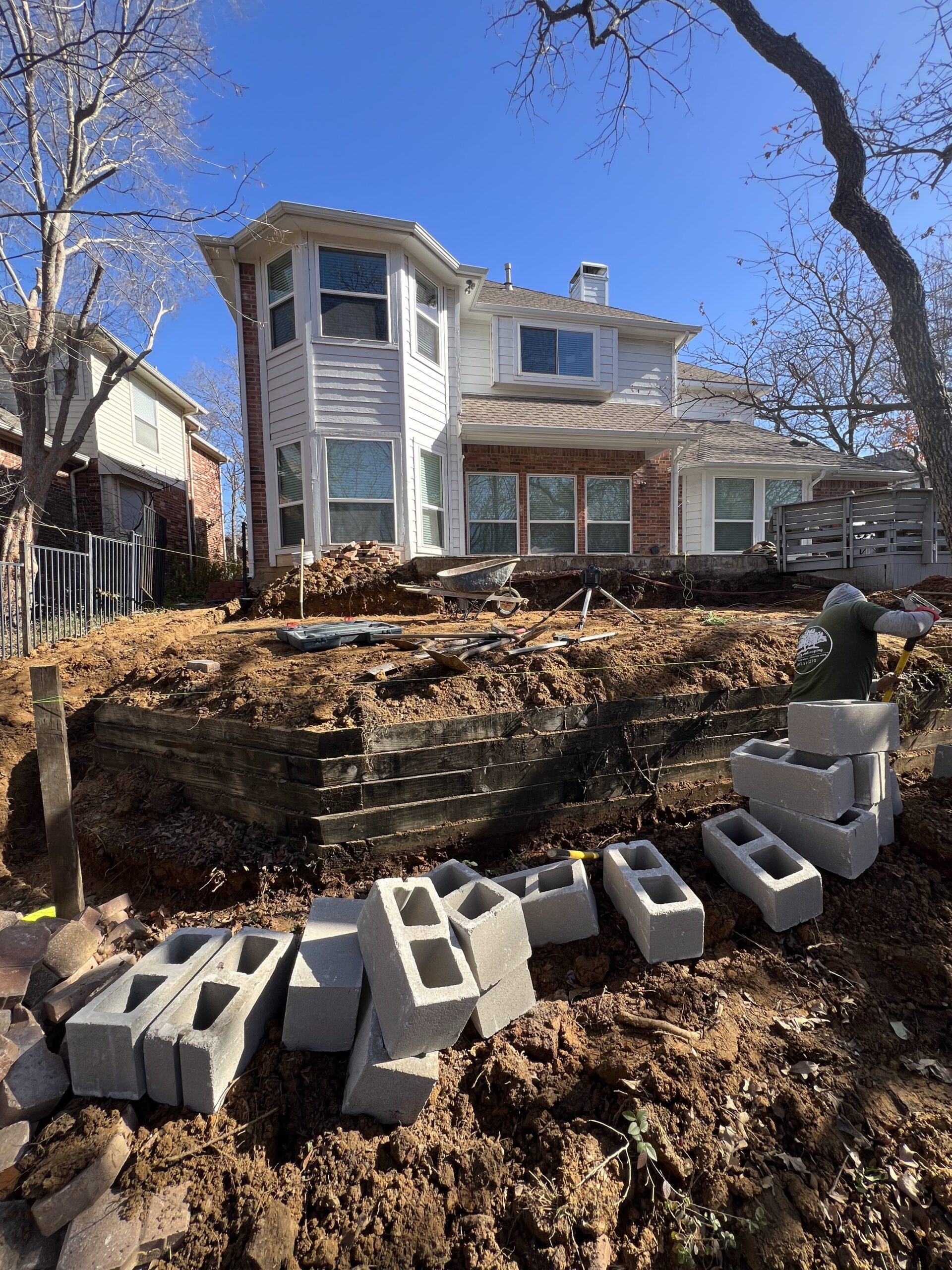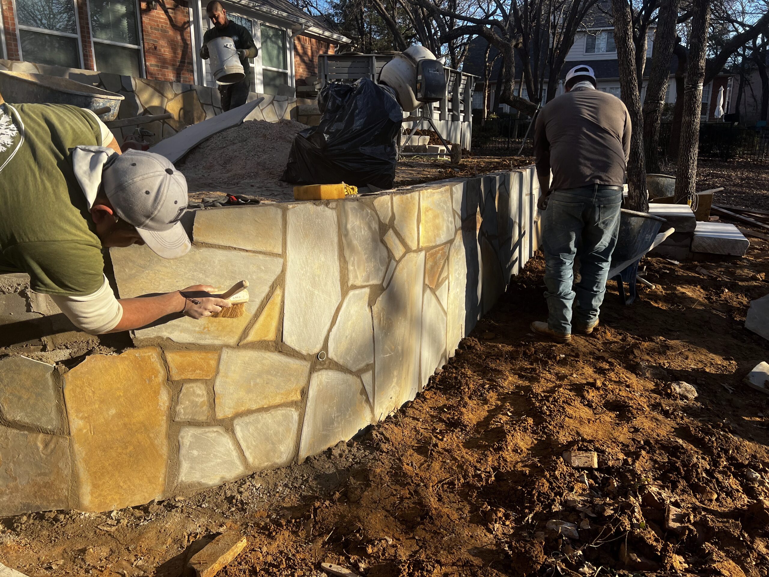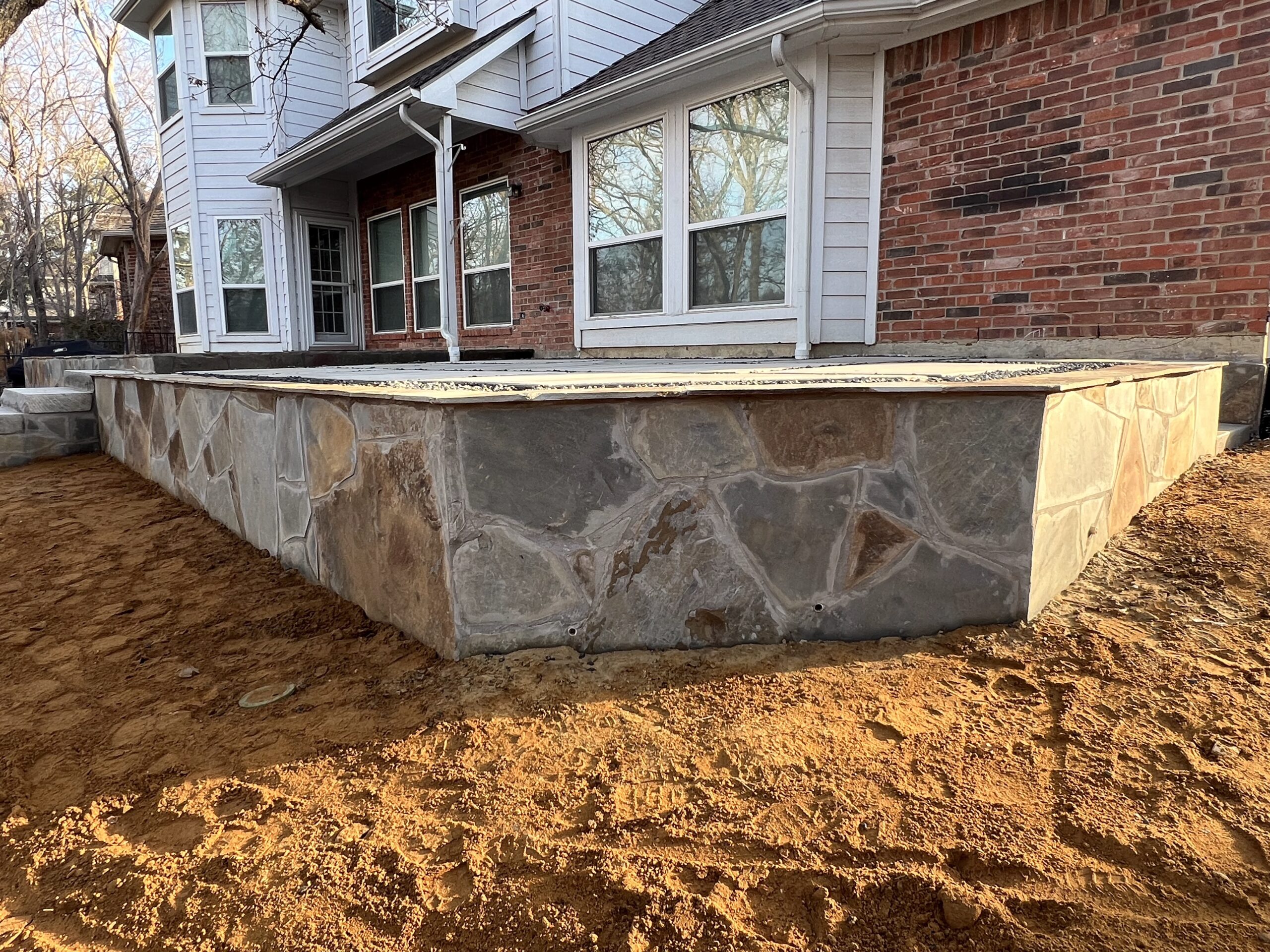 We began by demolishing the original wood deck and regrading the yard to create multiple usable levels. New stone retaining walls were built using a flagstone aesthetic to match the home’s existing patio, giving the entire backyard a cohesive look.