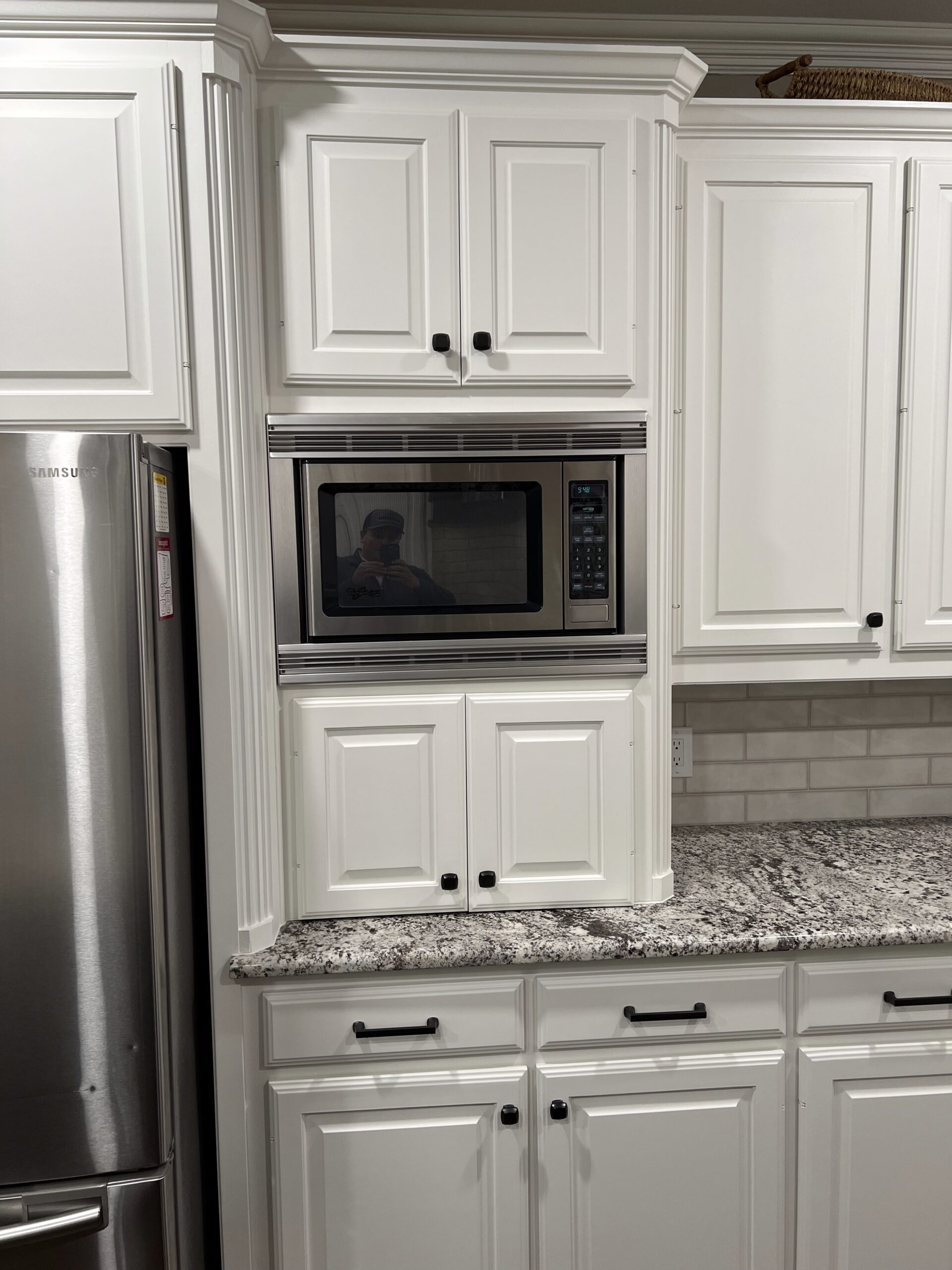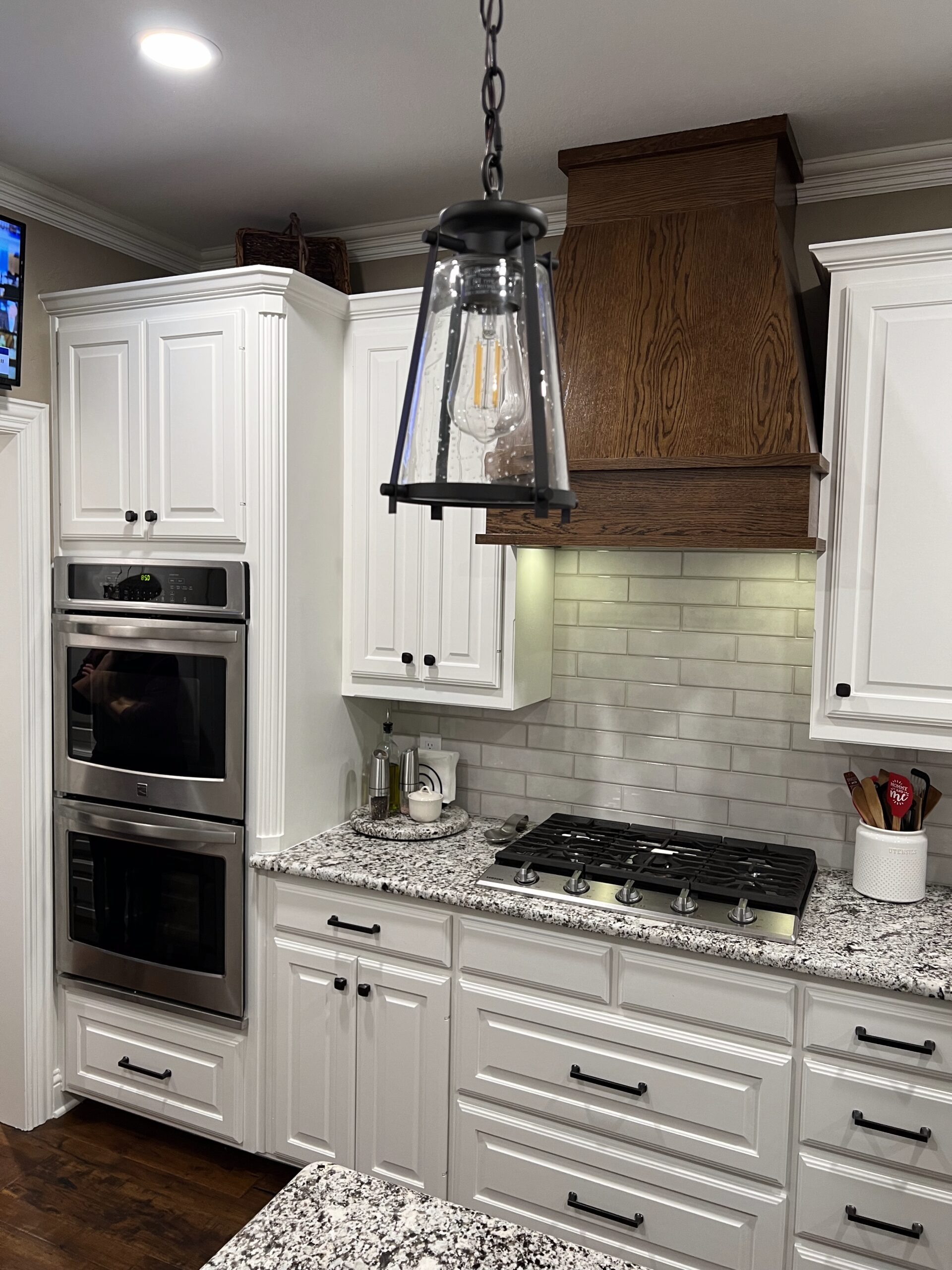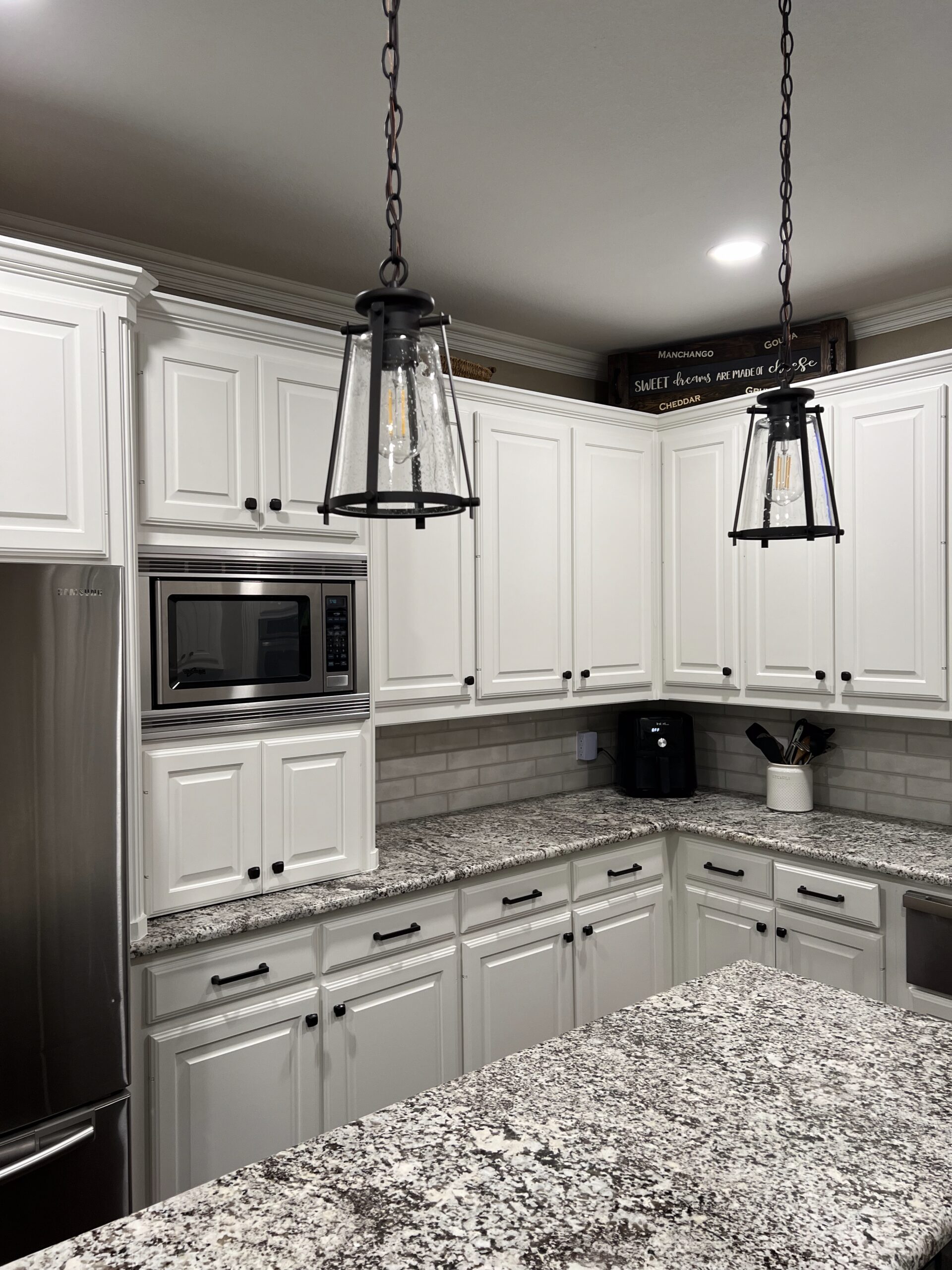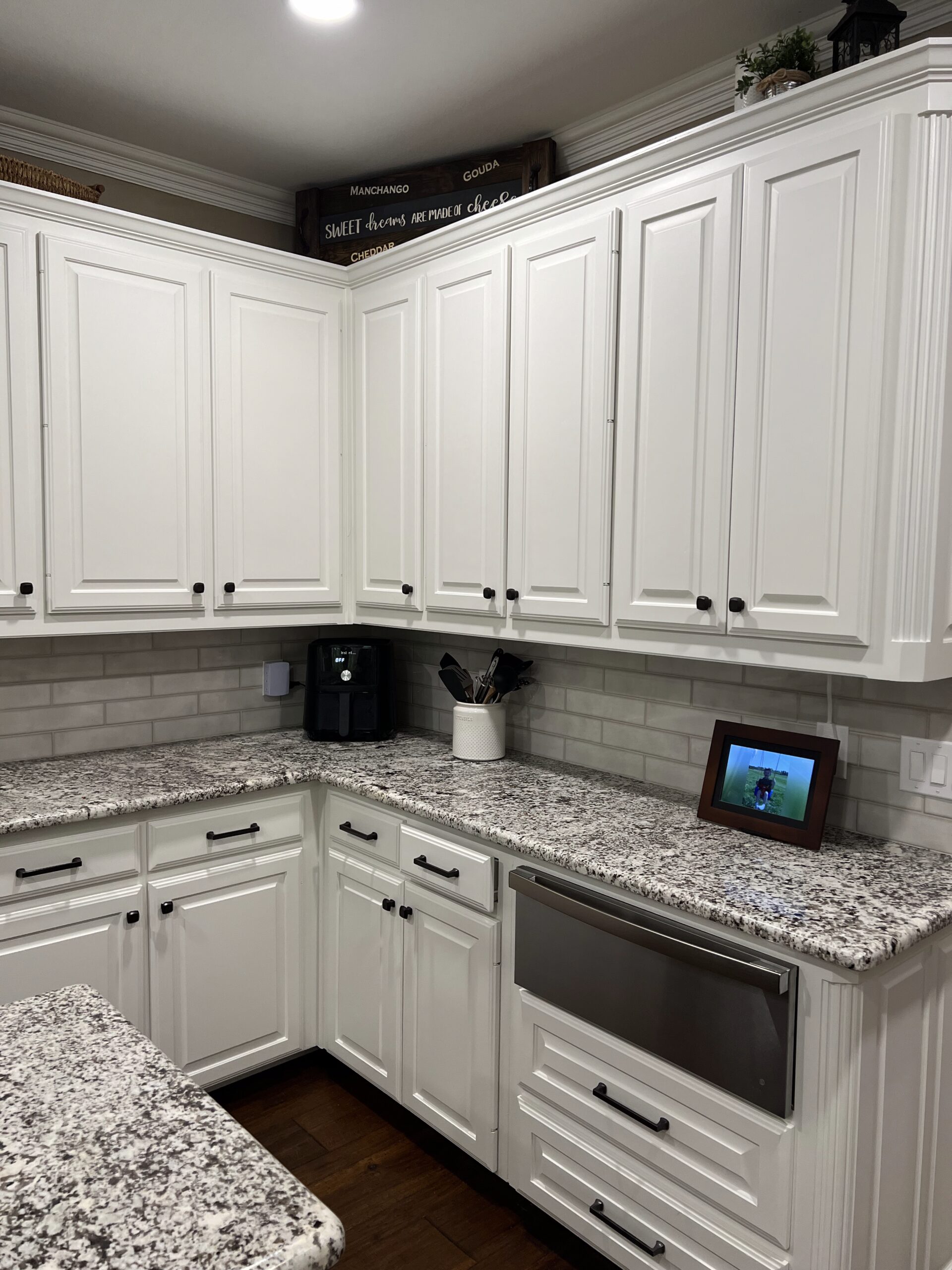This kitchen was in need a modern facelift. Rather than deleting the existing kitchen cabinetry, we modified and augmented by matching the style, painting, installing a new backsplash, and beautiful granite countertops.