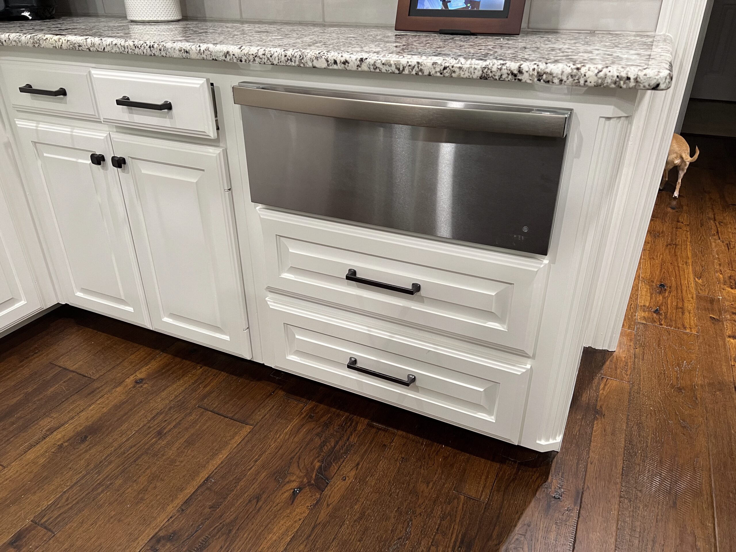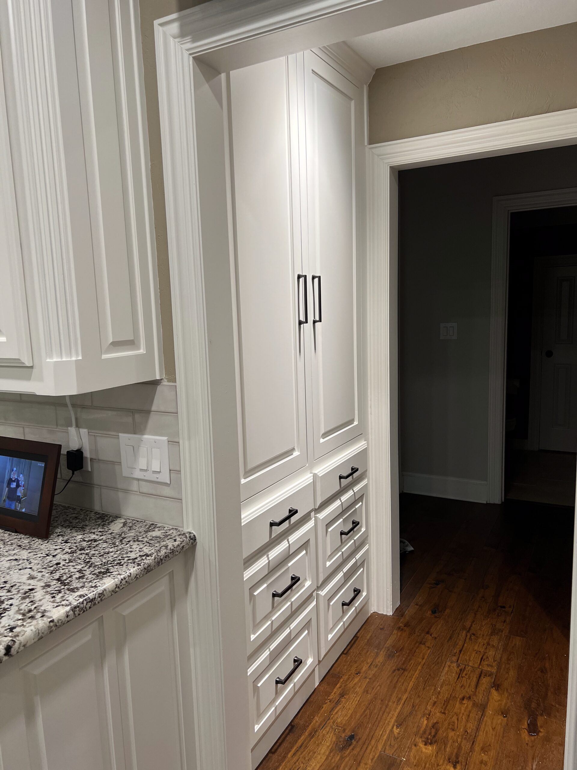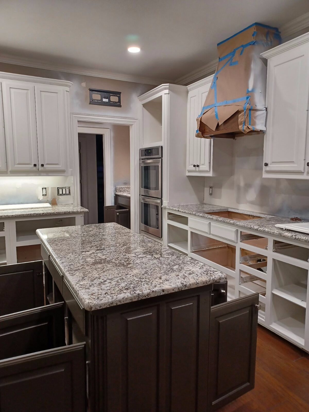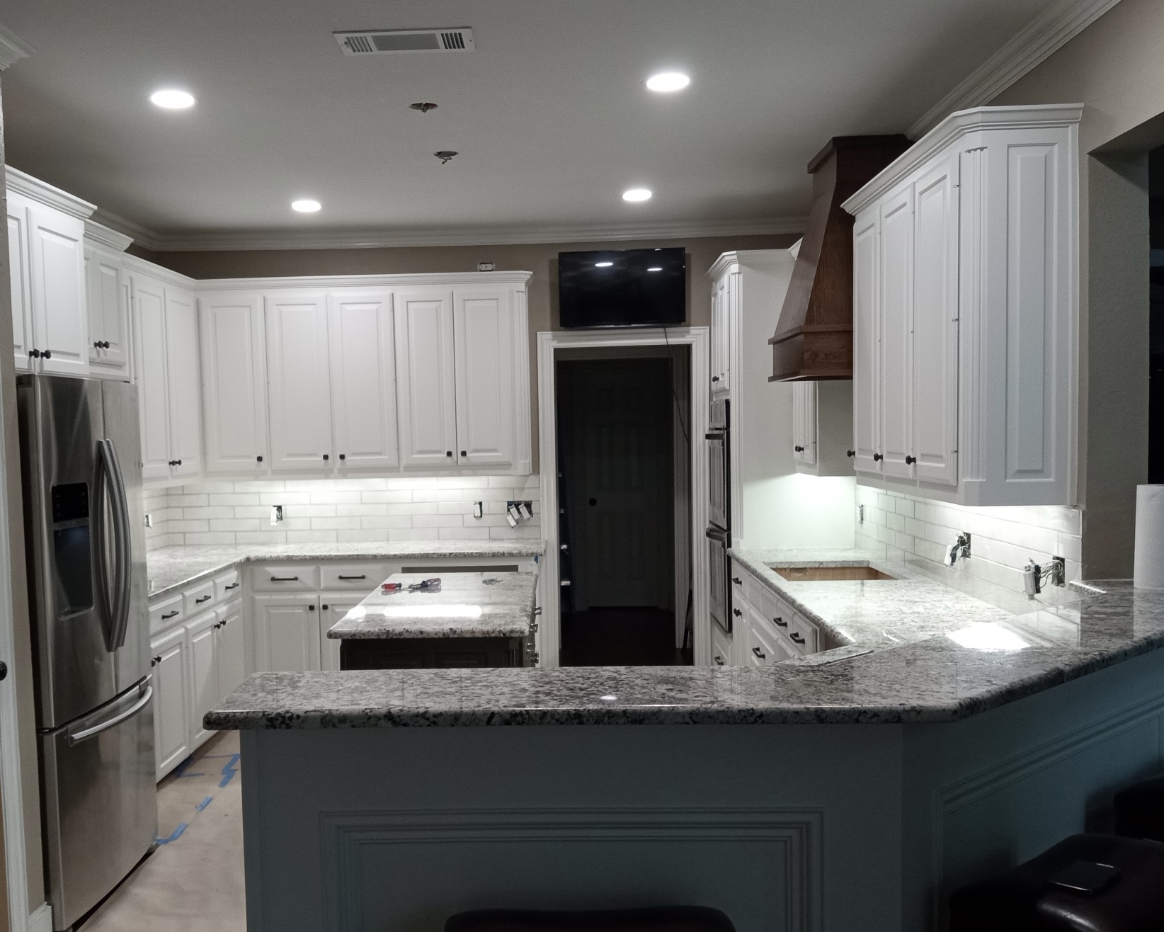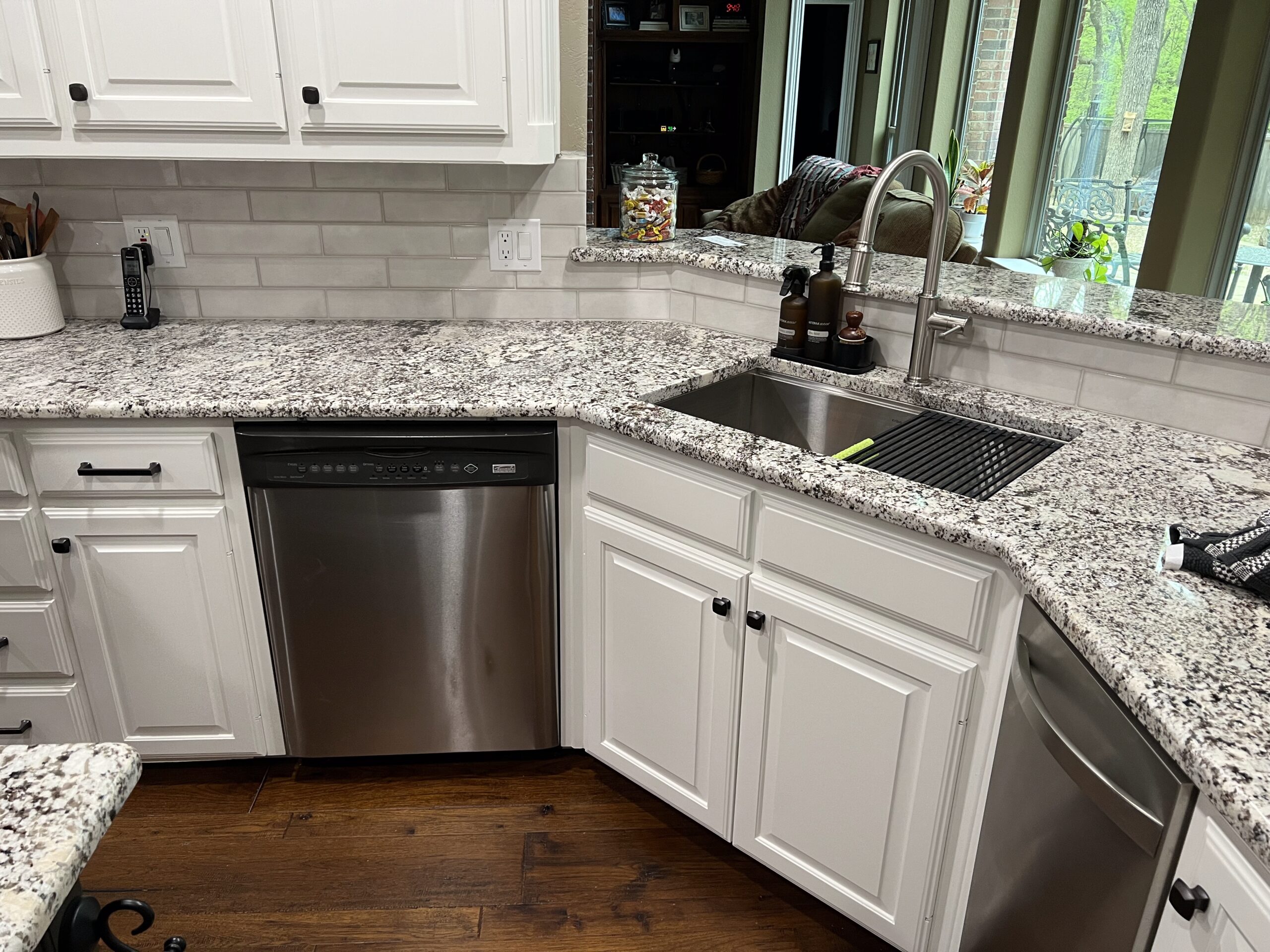 This kitchen was in need a modern facelift. Rather than deleting the existing kitchen cabinetry, we modified and augmented by matching the style, painting, installing a new backsplash, and beautiful granite countertops.