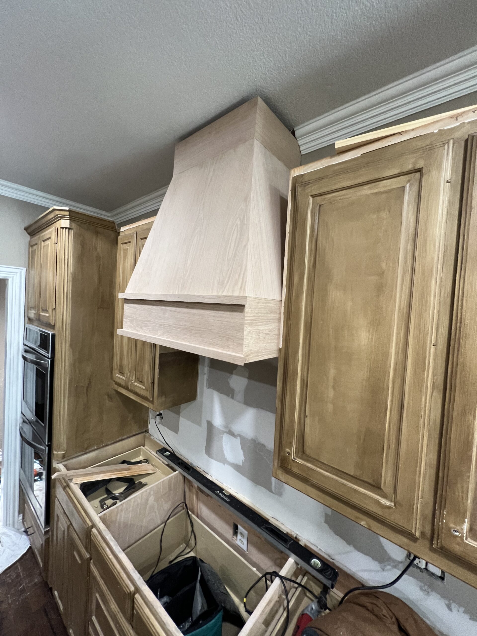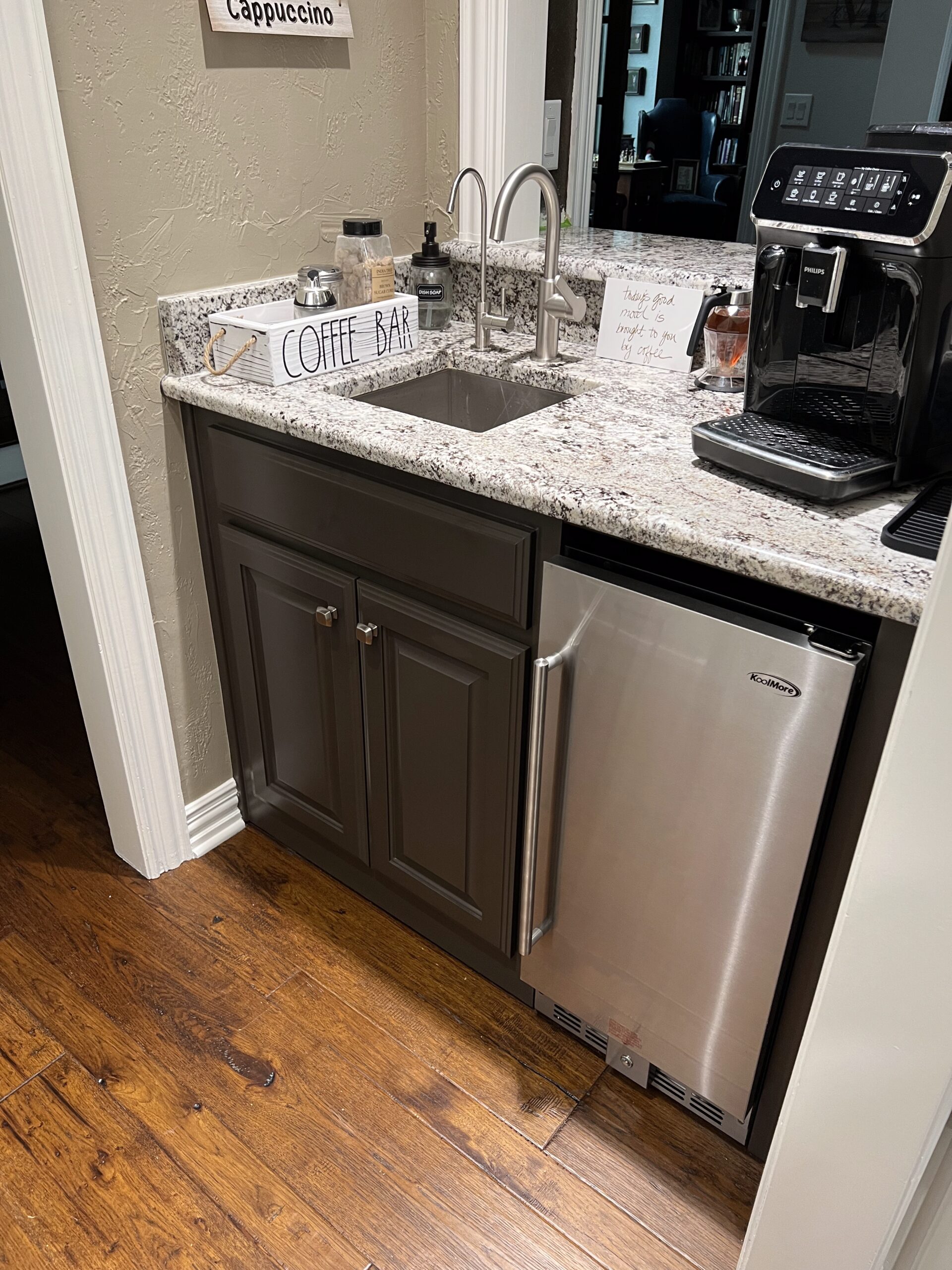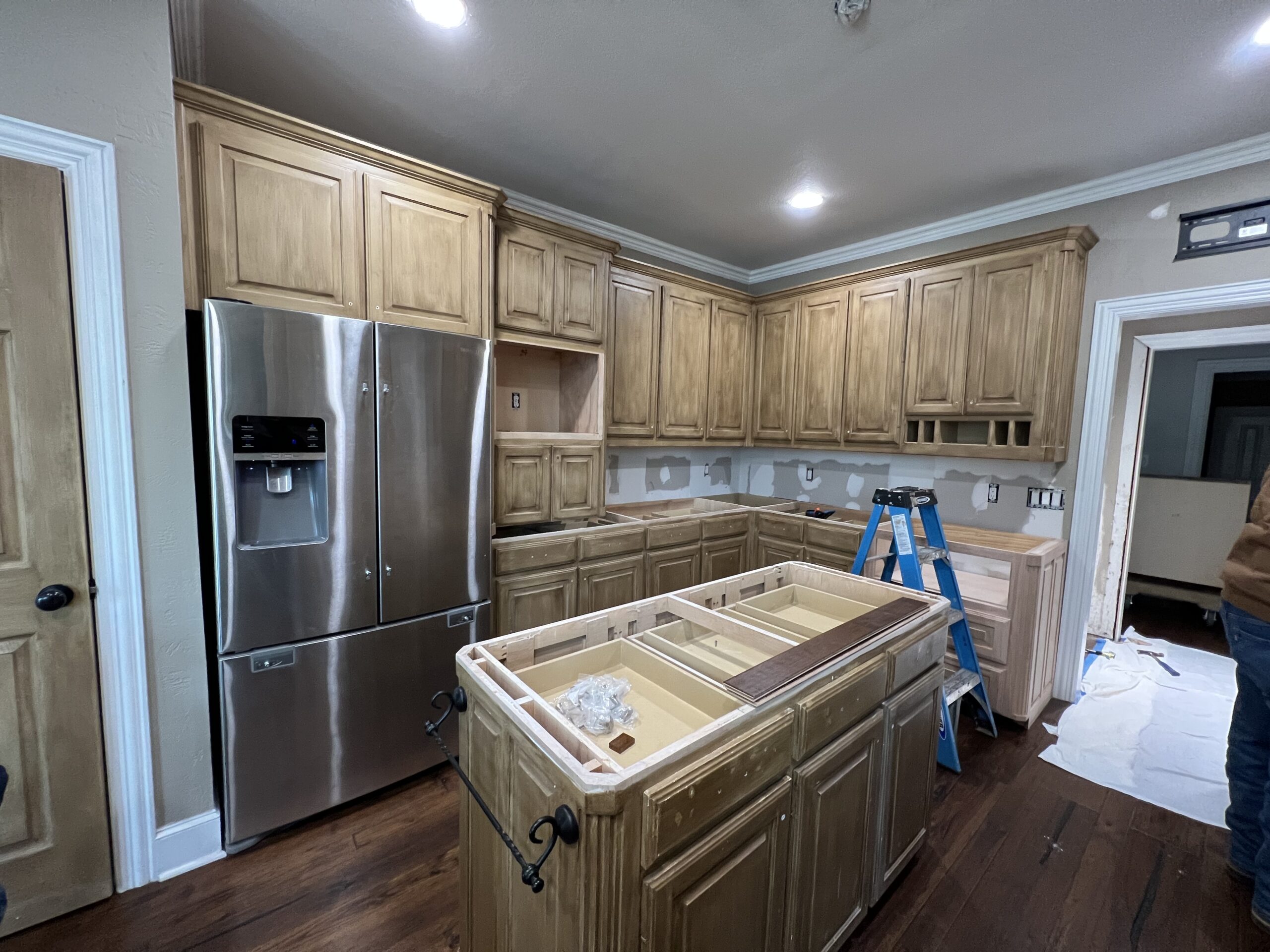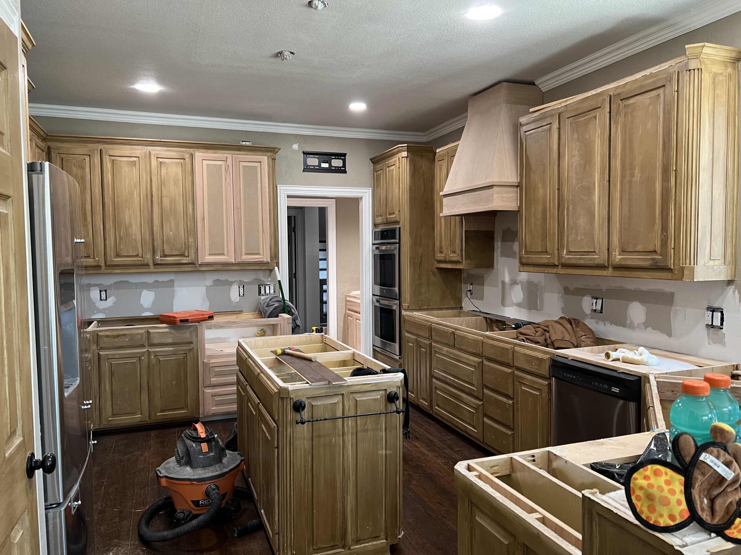 This kitchen was in need a modern facelift. Rather than deleting the existing kitchen cabinetry, we modified and augmented by matching the style, painting, installing a new backsplash, and beautiful granite countertops.