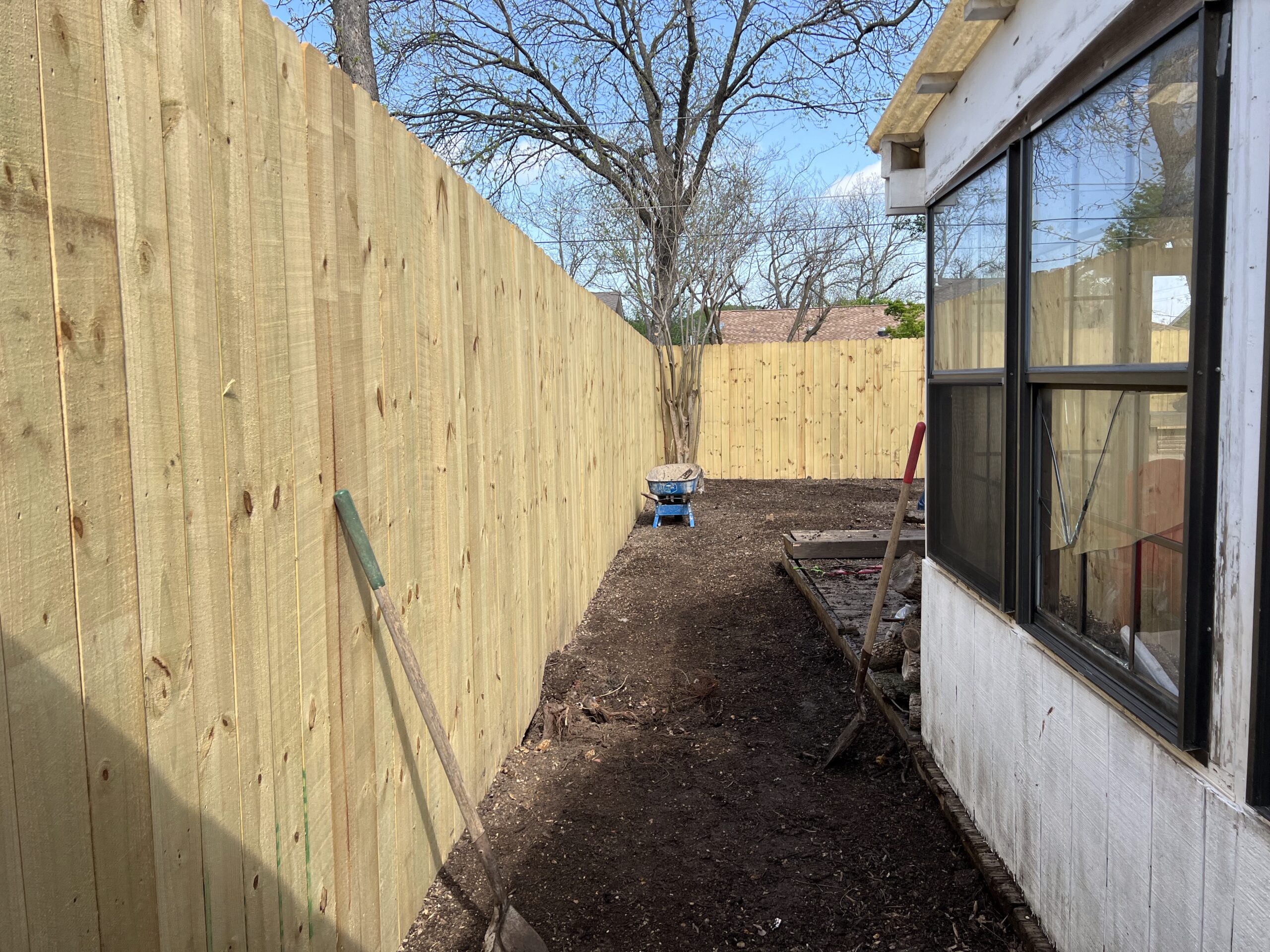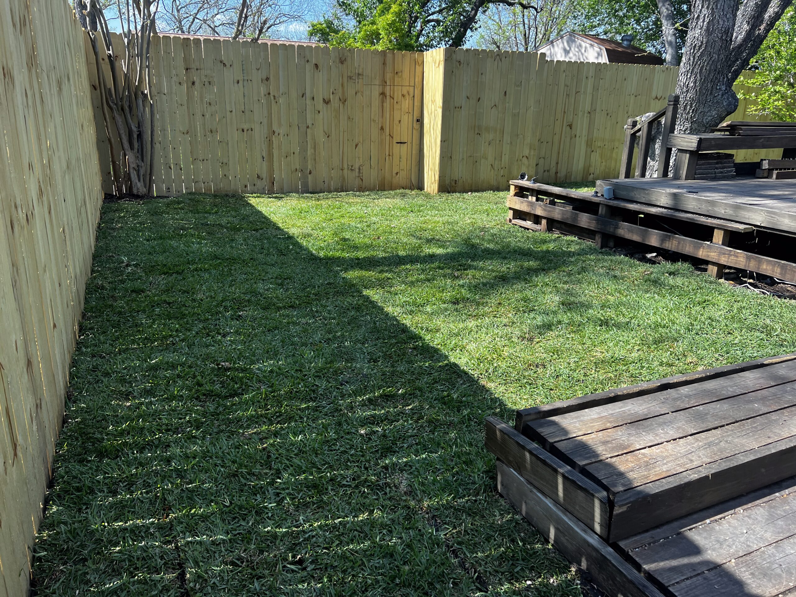 This Dallas outdoor project transformed a bare dirt yard into usable family space with new St. Augustine sod, proper grading, and deck repairs to improve safety and flow.
